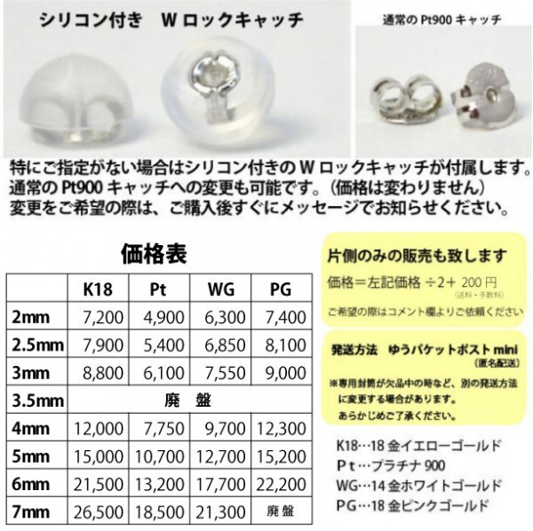 通常のPt900キャッチへの変更も可能です。(価格は同じです。) ご希望の際はご購入後すぐにメッセージにてお知らせください。