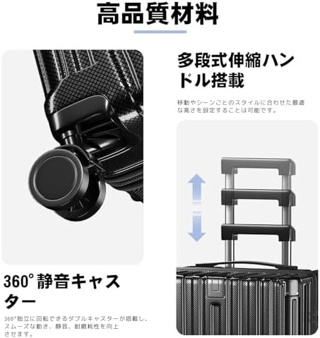 【360°静音キャスター・快適な弾性ハンドル】360°独立に回転できるダブルキャスターが搭載し、スムーズな動き、静音、耐磨耗性を向上させます。また、スーツケースにはシリコンソフトハンドルが2つ付属しています,人間工学に基づいた設計、柔らかくて握りやさしい、長時間持っても疲れにくい。