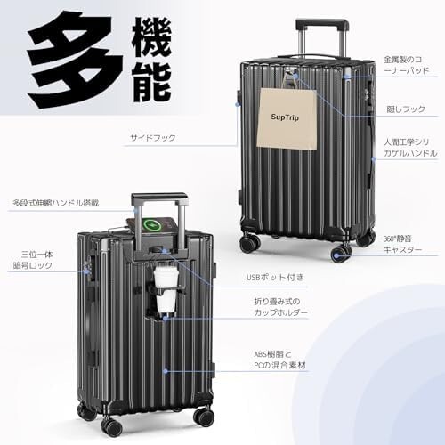 • 【2025年新発売・多機能スーツケース】2025年に業界の高品質スーツケースが新登場!隠しフックやサイドフック、USBポートが付属しており、スマートフォンやタブレットなどの機器を充電でき、外出先でカバンや小物を引っ掛けるのに便利!折りたたみ可能なカップホルダーは、水、コーヒーカップ、または他の飲料容器をいつでも置くことができます。あなたの旅をより快適にします。