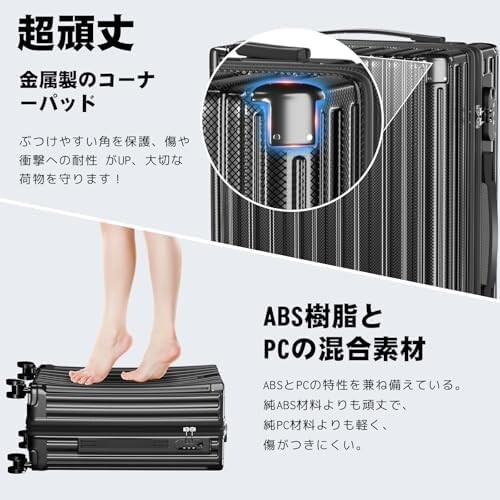 【軽量で頑丈なABS+PCボディ】 本体は軽量性と耐衝撃性に優れたABS樹脂とPCの複合素材を採用。女性でも楽に持ち上げられる重さです。表面に施された無数の微細な凹凸模様が傷つきを防止し、さらに四隅にアルミニウム合金製メタルガードを4ヶ所配置。耐衝撃性能を向上させることで、スーツケースの耐久性をさらに高めています。