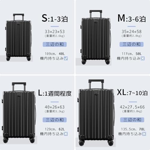 【サイズ】Sサイズ(機内持ち込みOK): 33×23×53cm(重量約2.6kg)、容量約40L(1~3泊対応);Mサイズ:35×24×58cm(重量約2.8kg)、容量約50L(3~6泊対応);Lサイズ:40×26×63cm(重量約3.2kg)、容量約62L(1週間程度);XLサイズ:42×27.5×66cm(重量約3.8kg)、容量約78L(7~10泊対応)※サイズ測定には多少の誤差がありご了承ください。