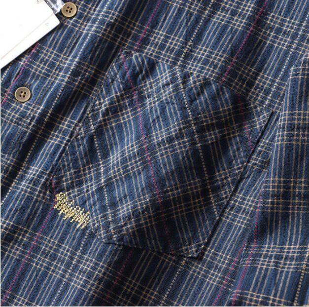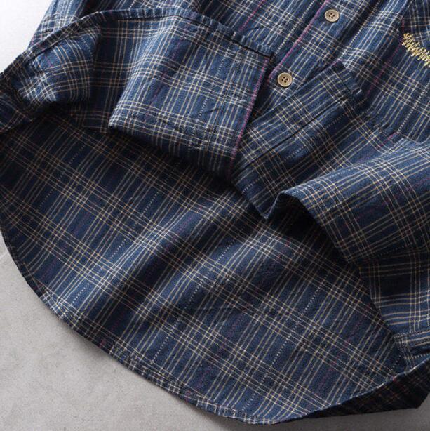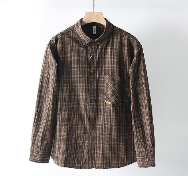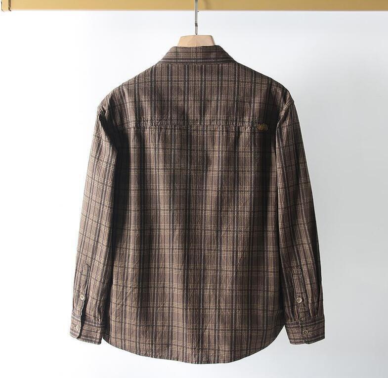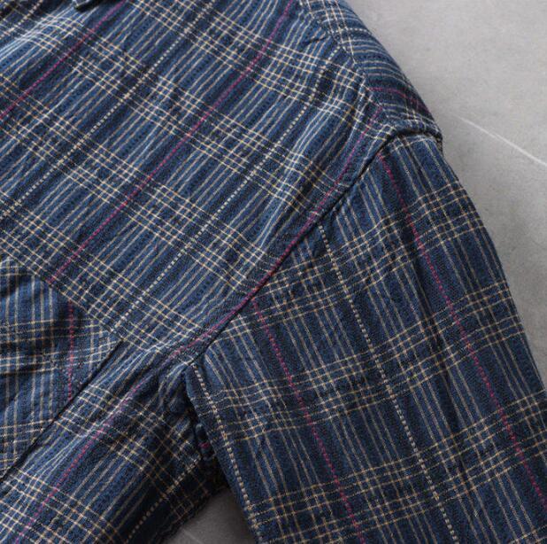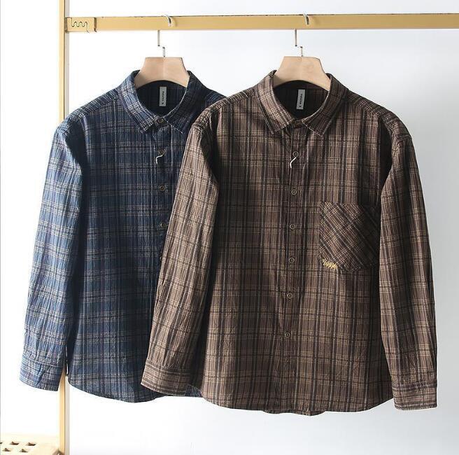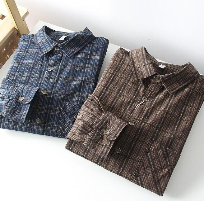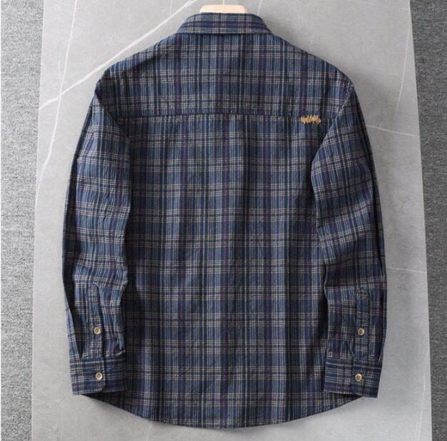 新入荷 ネイビー 新品 長袖シャツ 綿麻混 先染め ウォッシュ加工 格子柄 チェック 快適 通気 夏秋 ゆったり メンズ レギュラーカラー