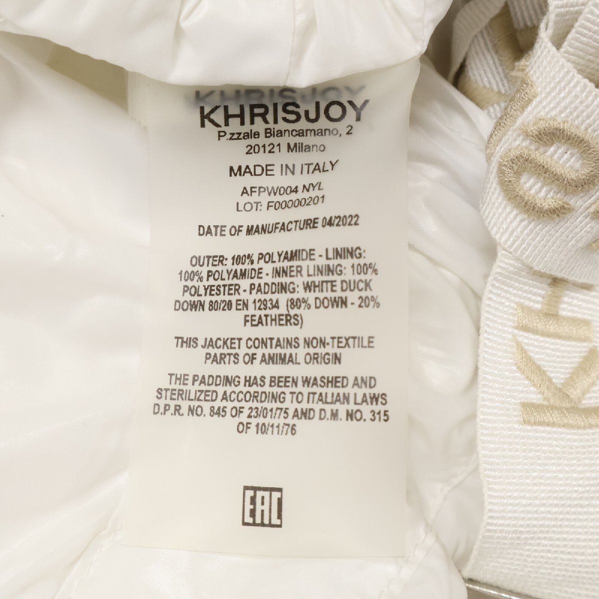 KHRISJOY クリスジョイ AFPW004 ホワイト シャイニー クロップドダウン ホワイト 表記無し ジャケット ポリアミド レディース 中古