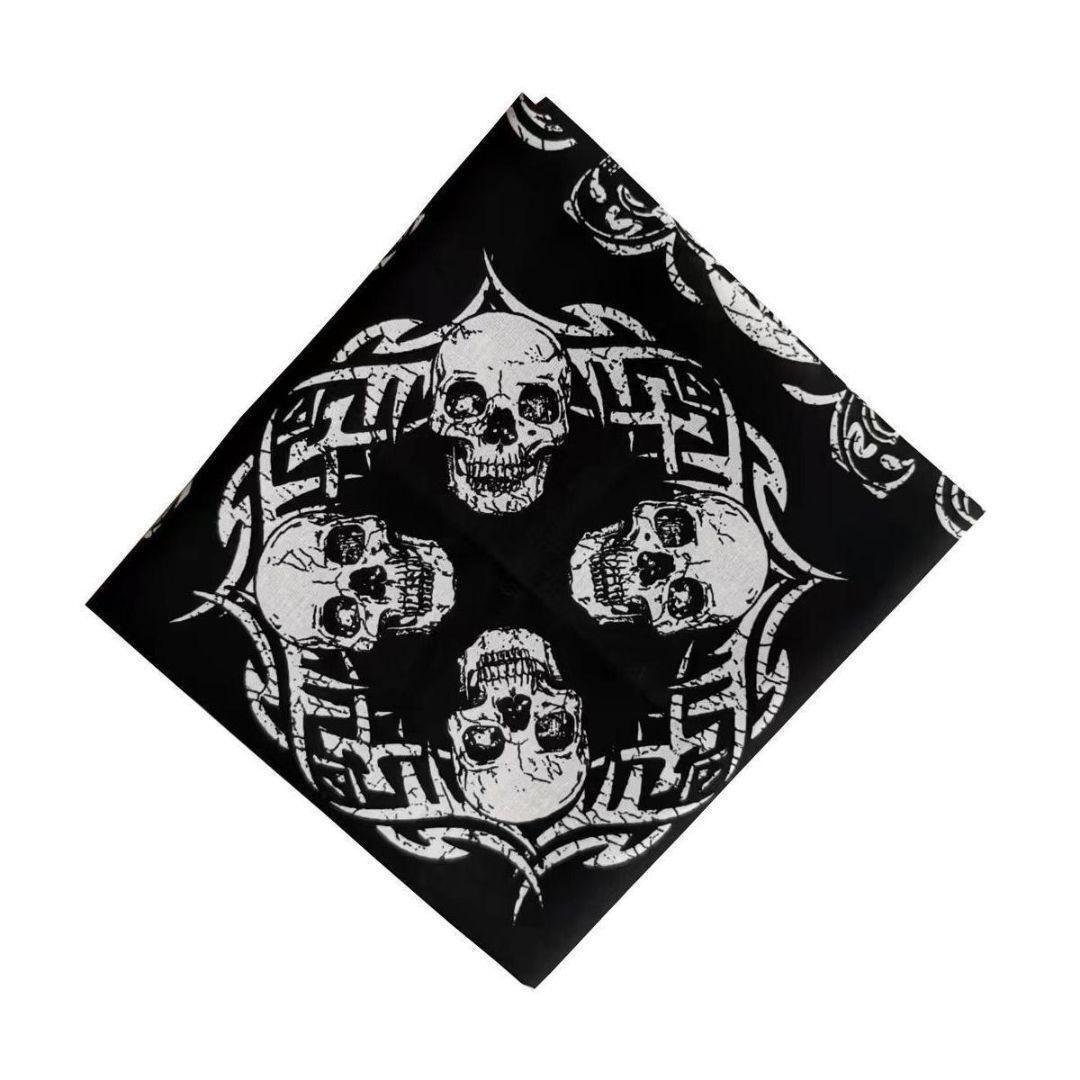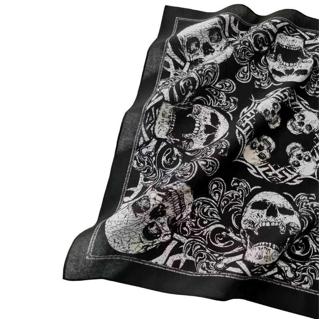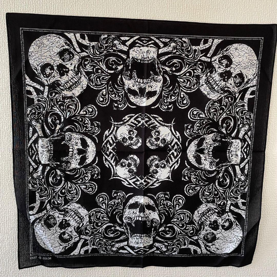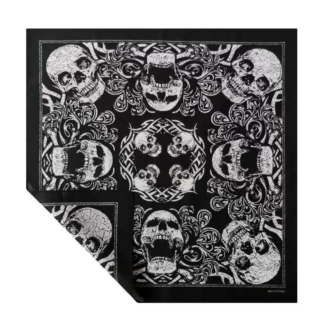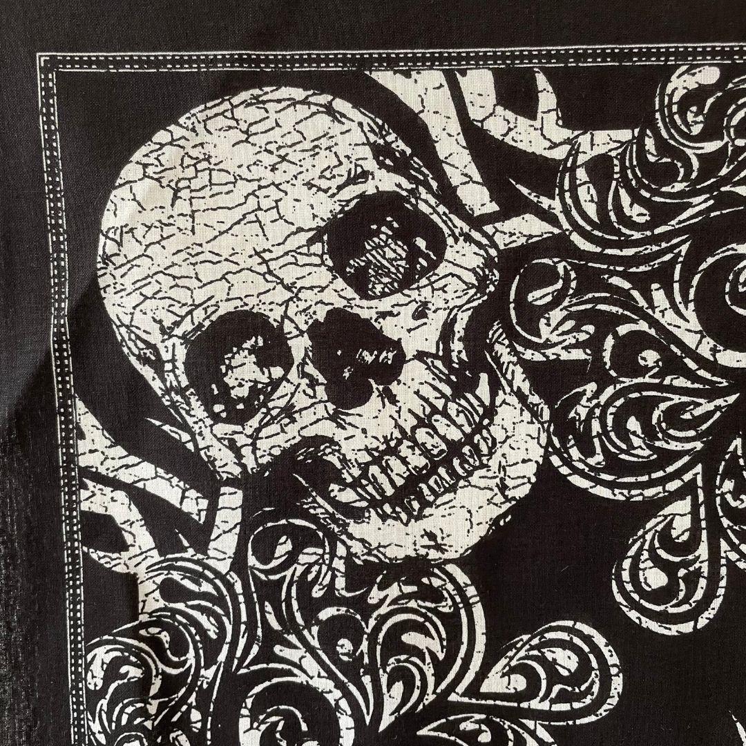 迫力あるスカル(ドクロ)デザインがプリントされたバンダナです。黒地に白のスカルが映えるデザインで、ロック・パンク系ファッションやバイカーアイテム、ハロウィンやフェスのアクセントにも最適です。