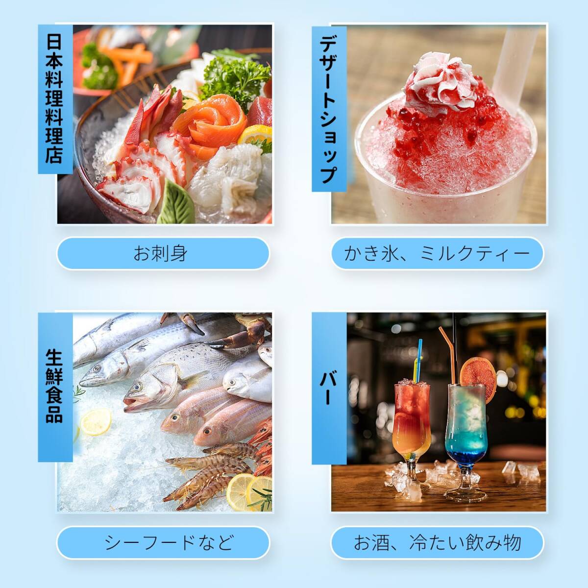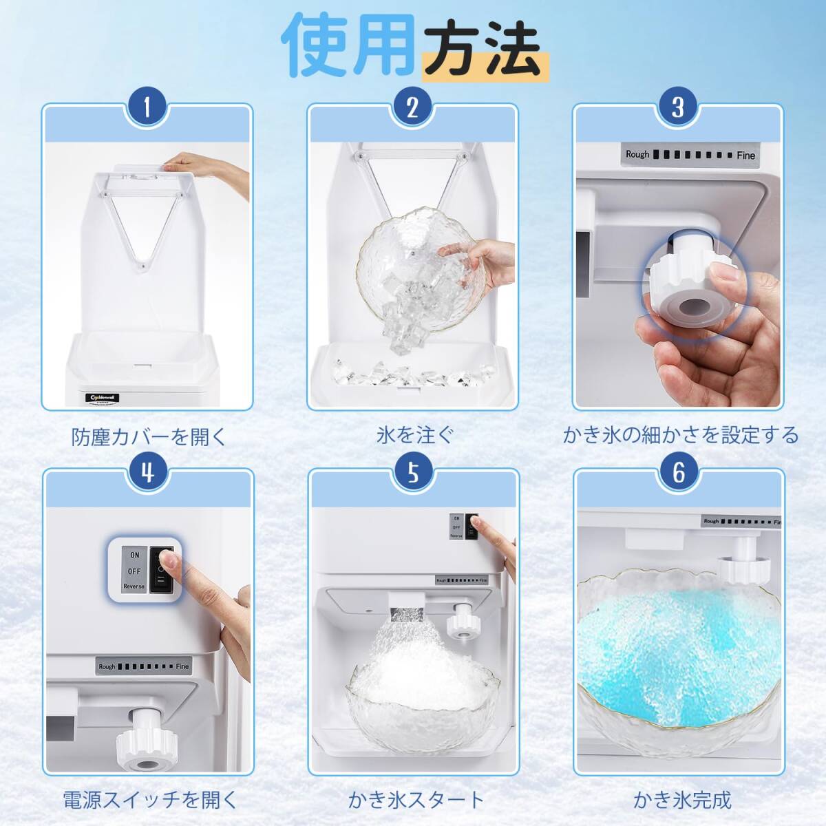 【使用する前にご了承ください。】こちらのかき氷機は、2-3cmの小さな氷しか砕けません。牛乳や果物などの他の食材を砕くことはできません。そうすると、機械が破損する可能性がありますし、大きな氷を砕くのは機械の詰まり、モーターの焼損する原因になります。運転中に氷がアイスタンクにぶつかり、音が大きくなる場合がございます。