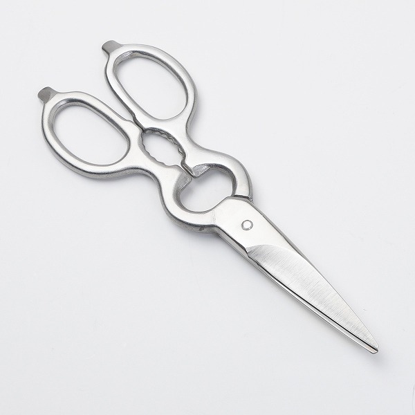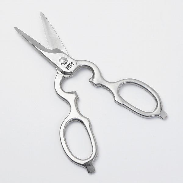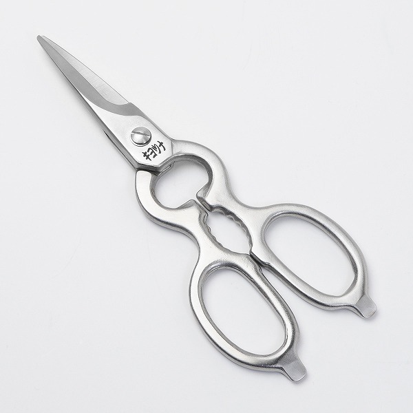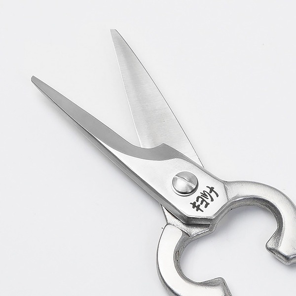 片側の刃を受け刃状に湾曲にし、もう一方の刃を包丁のような刃付にすることで、ハサミ自体に包丁とまな板の役割を持たせています。