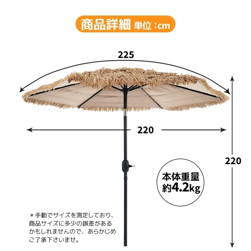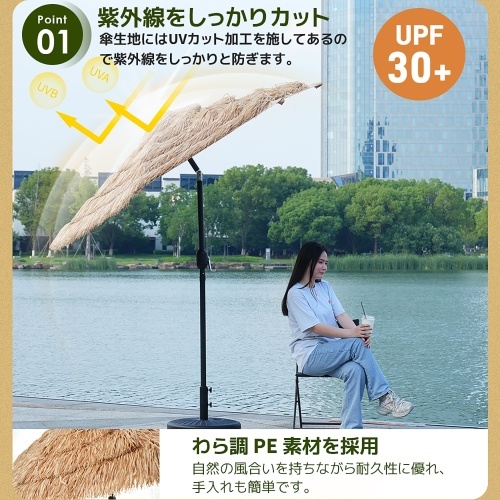 • 【紫外線をしっかりカット 】傘生地にはUVカット加工を施してあるので紫外線をしっかりと防ぎます。 30+UPF わら調 PE 素材を採用 自然の風合いを持ちながら耐久性に優れ、手入れも簡単です。 急な雨でもしっかりと水を弾く安心の撥水加工 お庭やバルコニーでのひとときを、どんな天候でも楽しむことができます。※完全防水ではありません。
