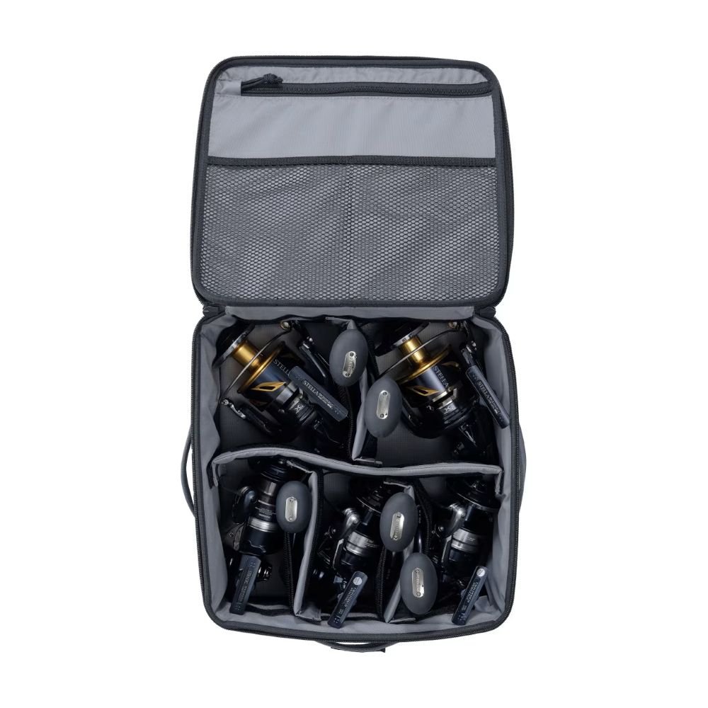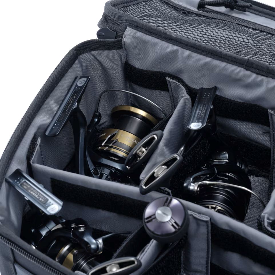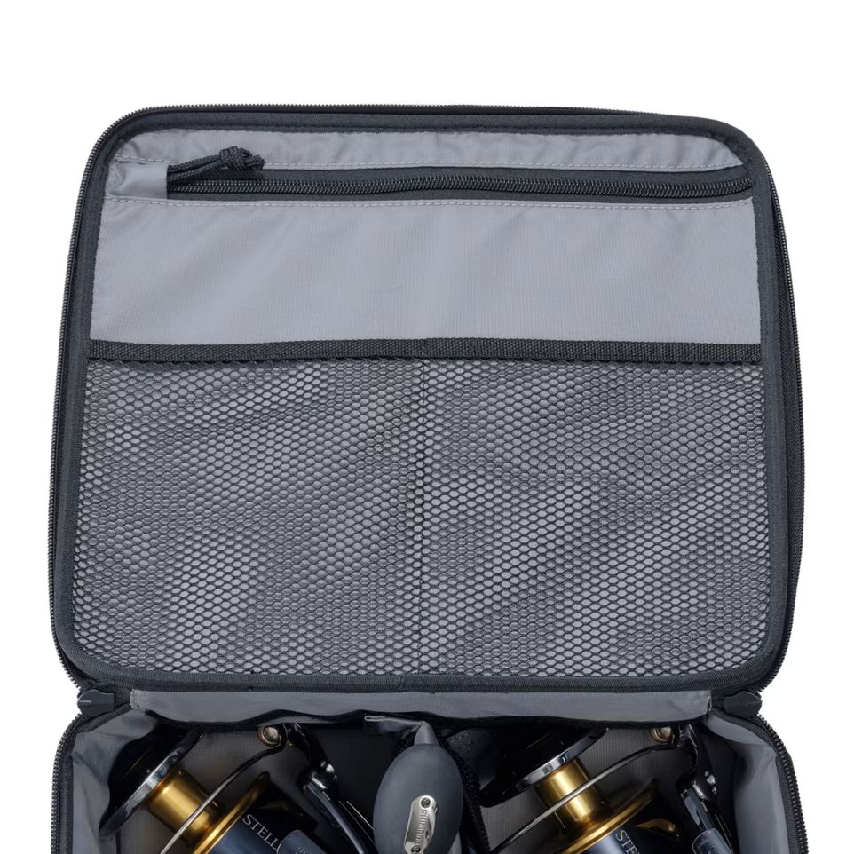 シマノリールを想定した3サイズ展開と着脱式の仕切りが付き、所有リールに合わせた収納が可能です。
