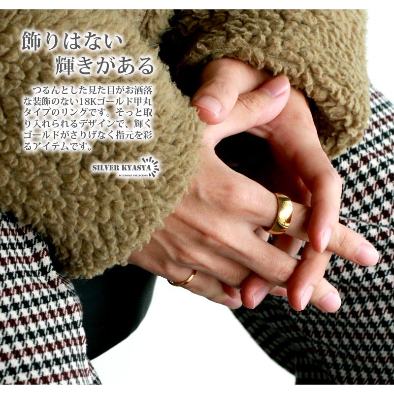 ・つるんとした見た目がお洒落な装飾のない18Kゴールド甲丸タイプのリングです。そっと取り入れられるデザインで、輝くゴールドがさりげなく指元を彩るアイテムです。