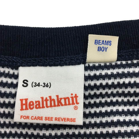 ヘルスニット BEAMS BOY カットソー Tシャツ ラウンドネック プルオーバー ボーダー 半袖 S(34-36) 紺 白 ネイビー ホワイト レディース