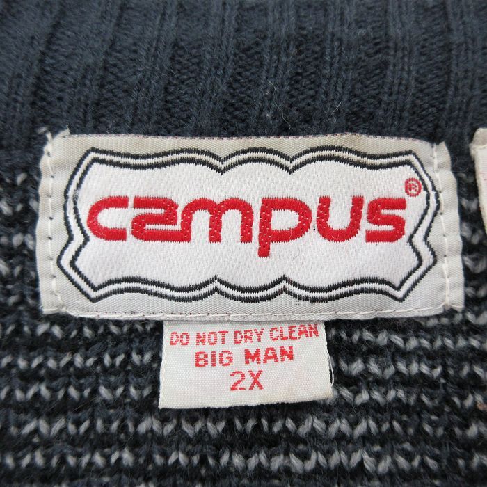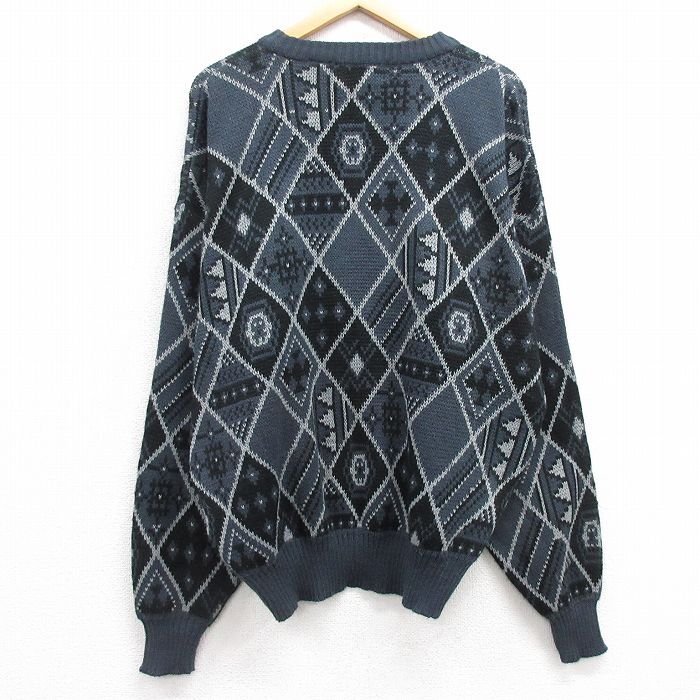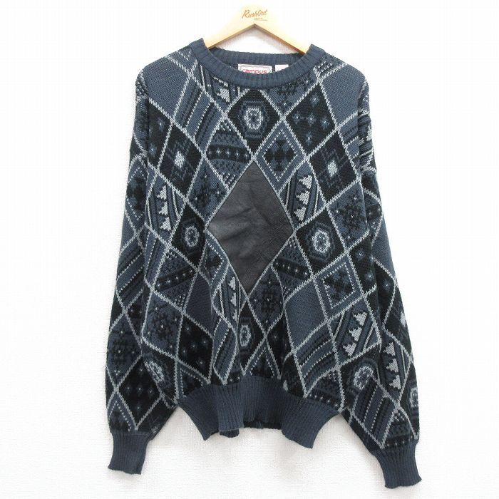 【商品名】 XL★古着 キャンパス 長袖 セーター メンズ 00年代 00s ネイティブ柄 ラグ柄 レザー使用 アクリル クルーネック 紺他【spe】
