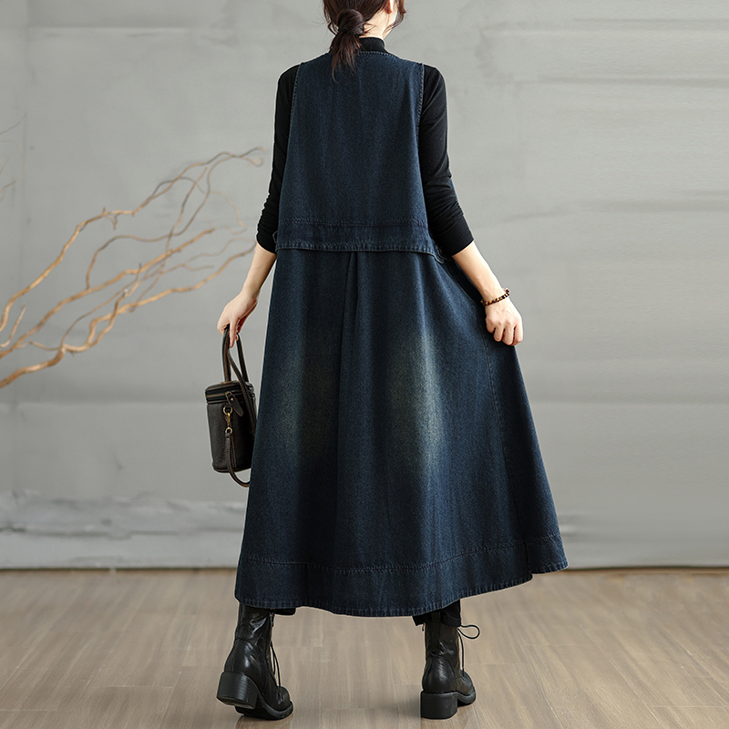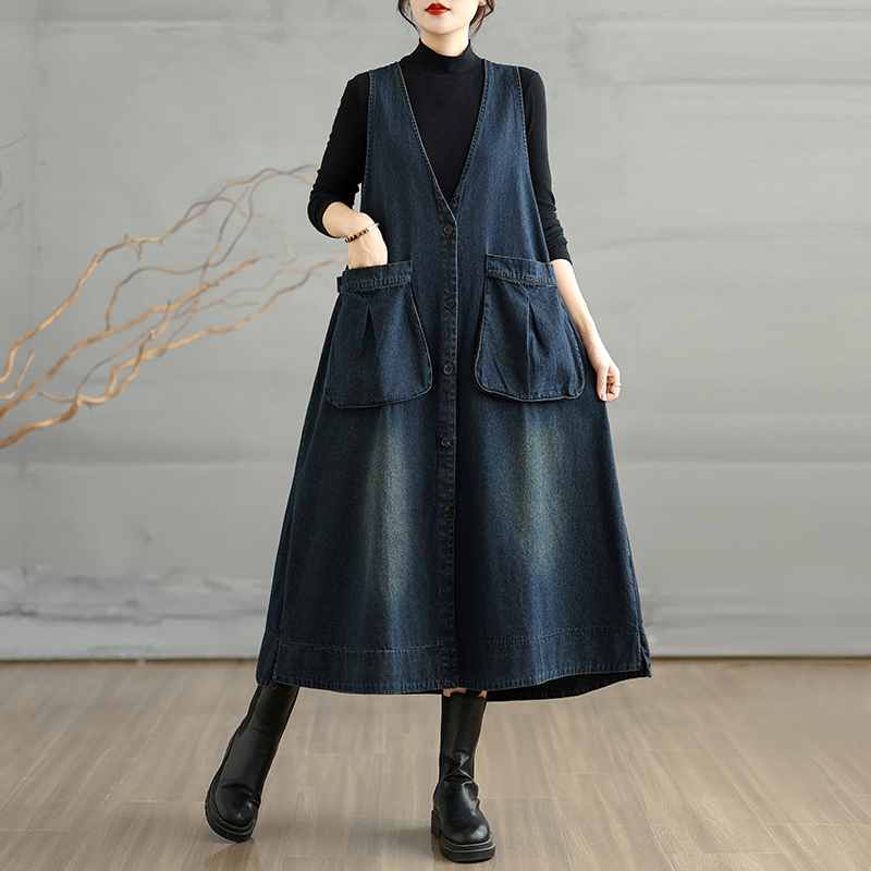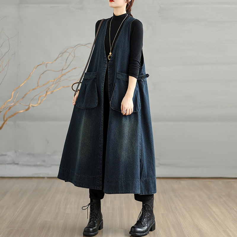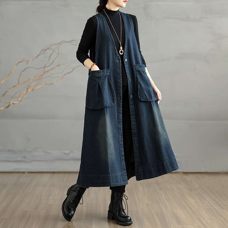 新入荷~上質 デニムベスト ロングベスト レディース マキシベスト デニム ロング丈 袖なし 前開き ポケット付き ベストアウター