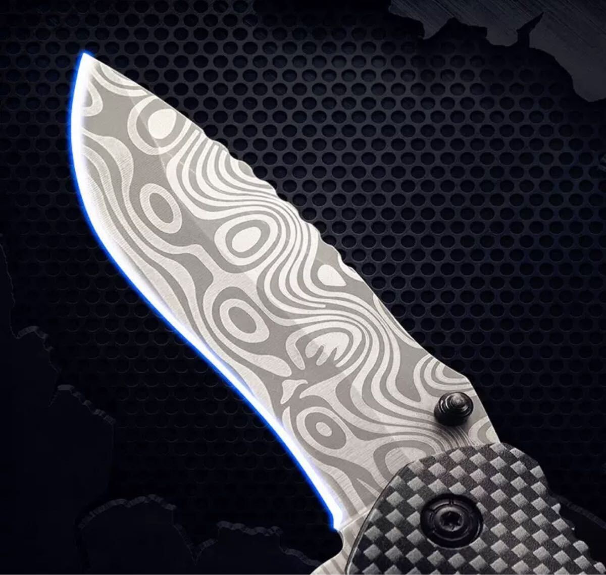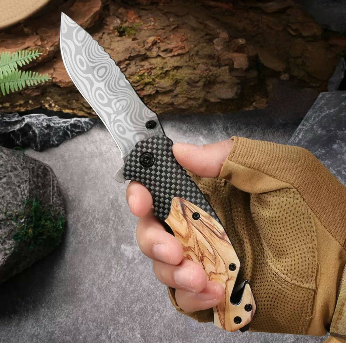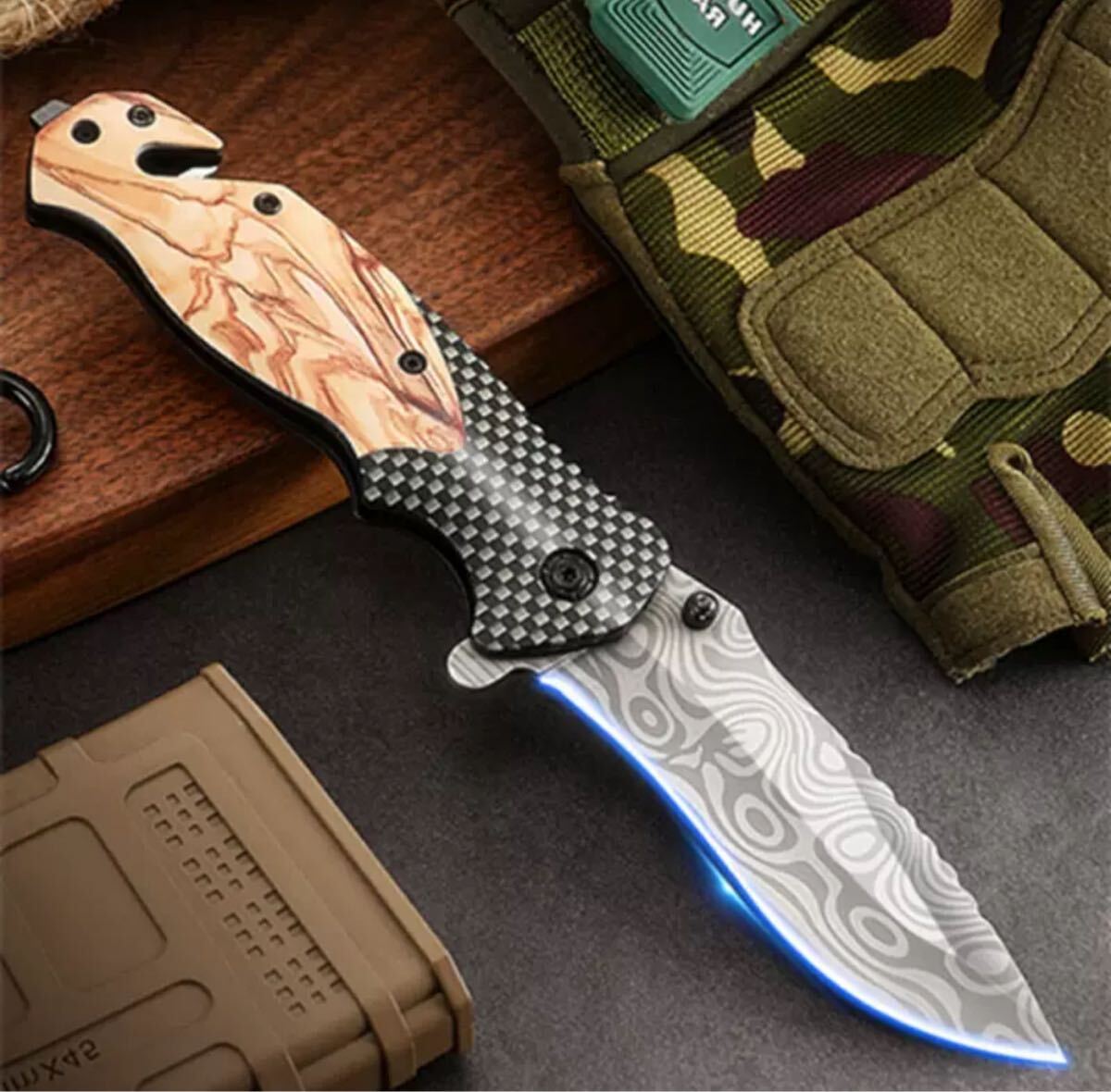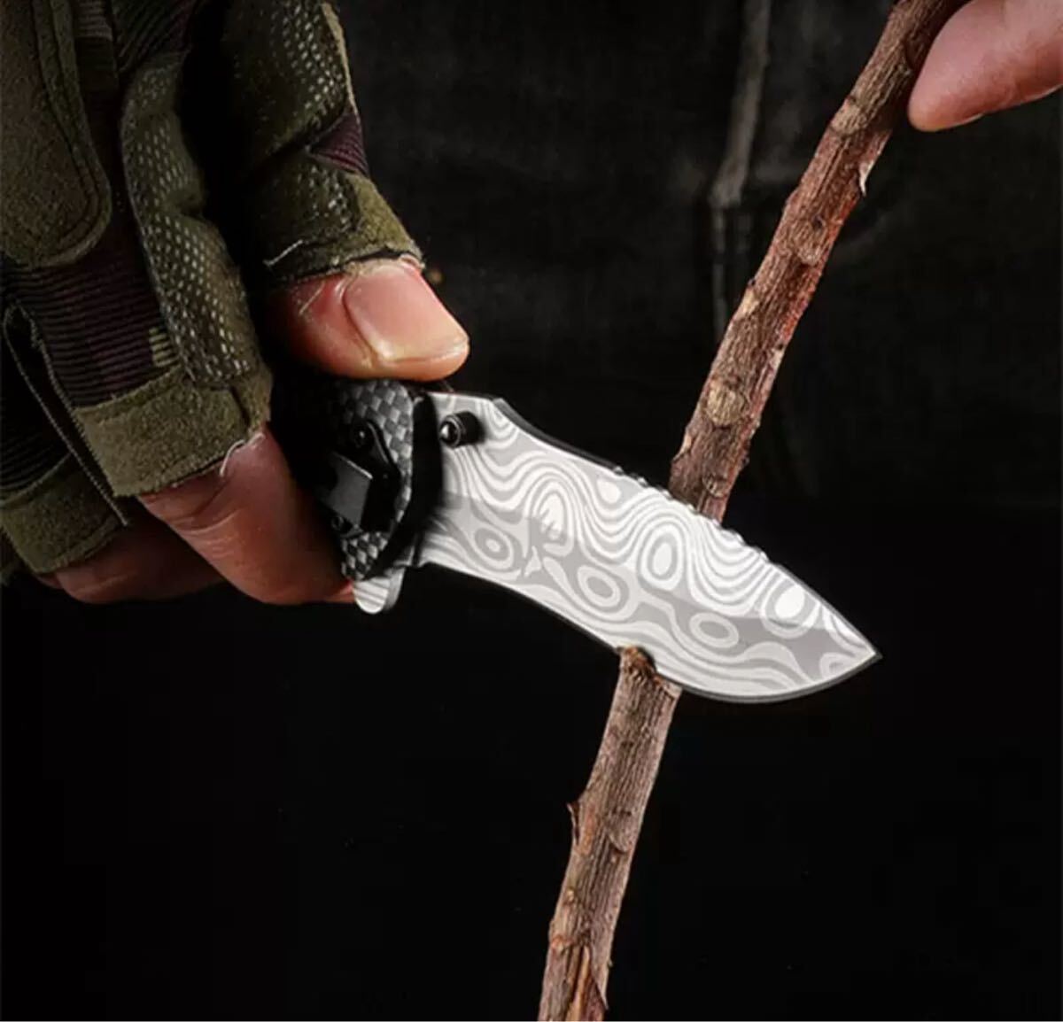 ダマスカス柄 片手ナイフ アウトドア用ステンレス折りたたみナイフ 高硬度折りたたみナイフ クリップ付きポケットナイフ サバイバルナイフ