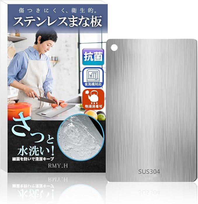 SUS304ステンレス製、滑り止め加工で安全に使用できるまな板。 - Material: ステンレス (SUS304) - Feature: 滑り止め加工 - Cleaning: 水洗い可能 - Antibacterial: 抗菌仕様 - Design: ワイヤードローイングプロセス 木製のように板の中に菌がほびこって黒ずんだり 摩耗したりはしません。大きさは30㎝×20㎝ A4とほぼ同じ大きさです。 余談 SUS304の特徴 クロムを18%、ニッケルを8%含むSUS304は、オーステナイト系ステンレス鋼の代表的な材質であり、良好な耐食性、加工性、溶接性など多くの優れた特性を備えています。