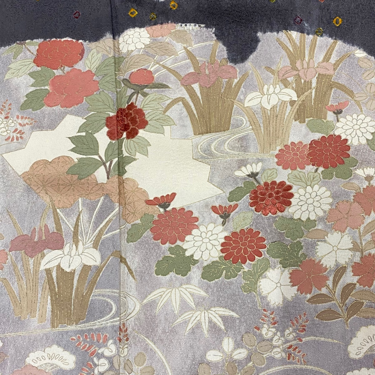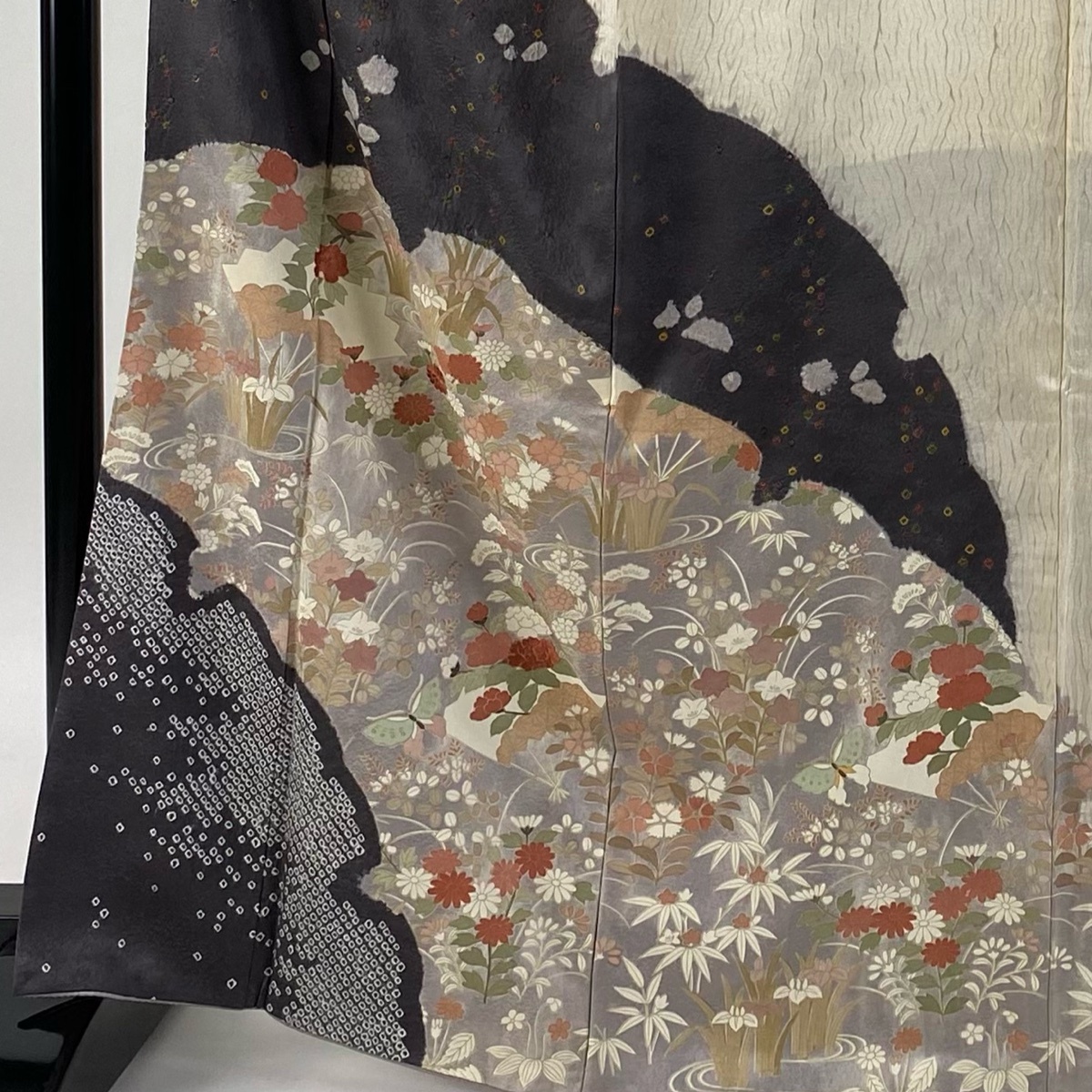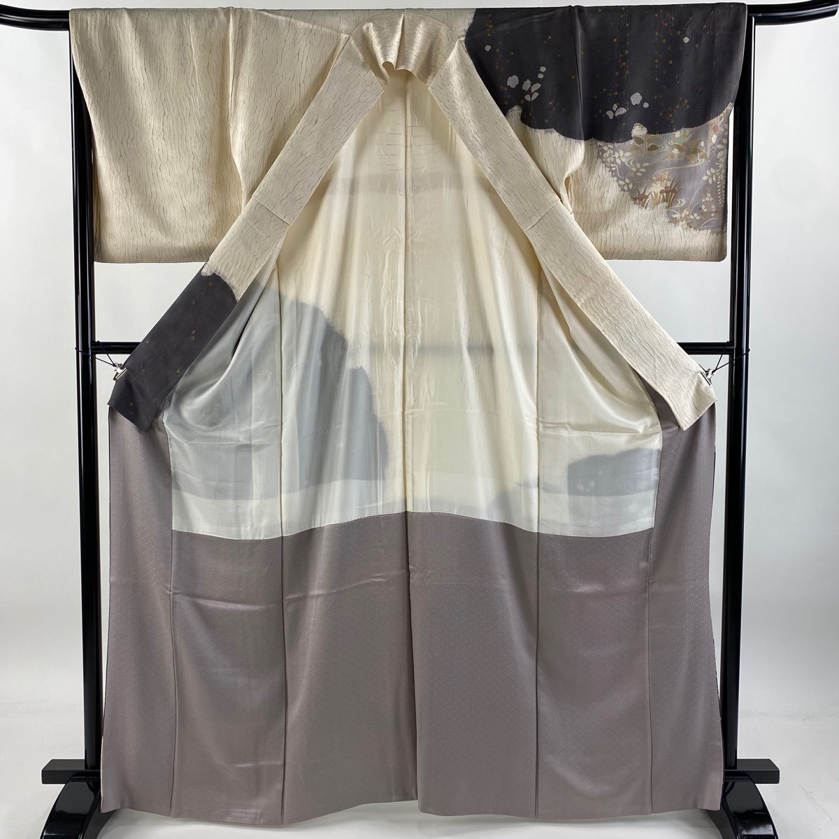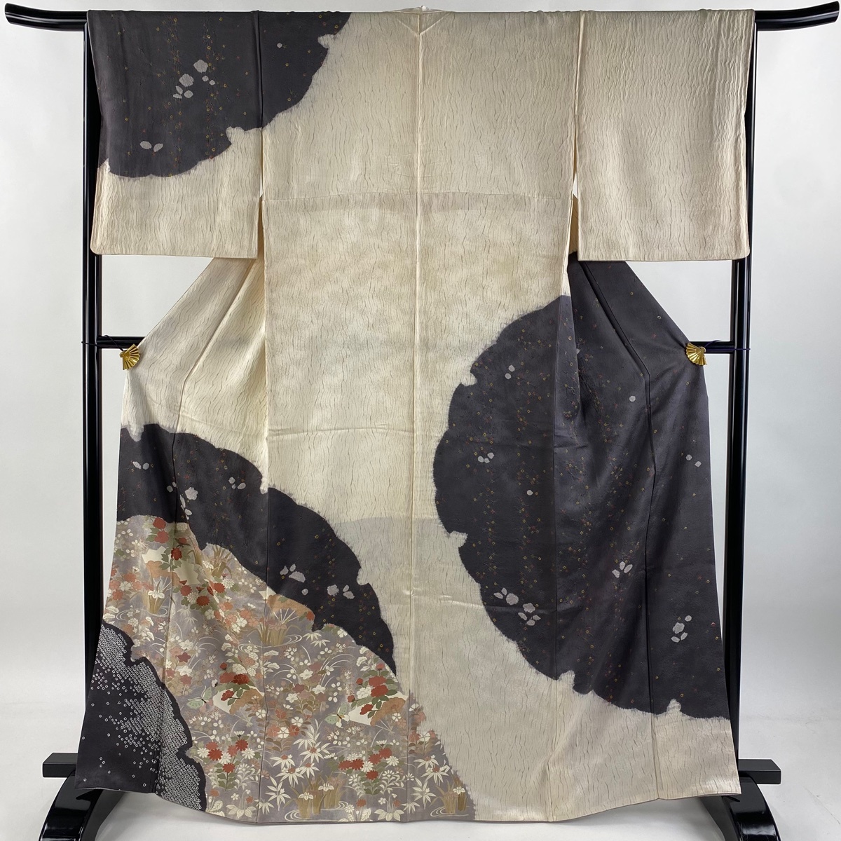 | 付下げ 秀品 草花 扇 刺繍 絞り クリーム 袷 身丈166 裄丈66 M 正絹 【中古】 |