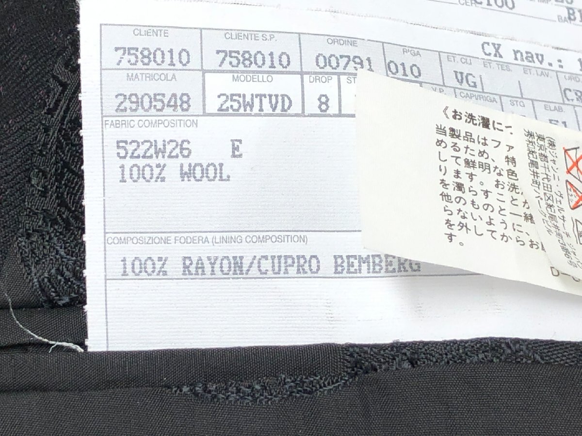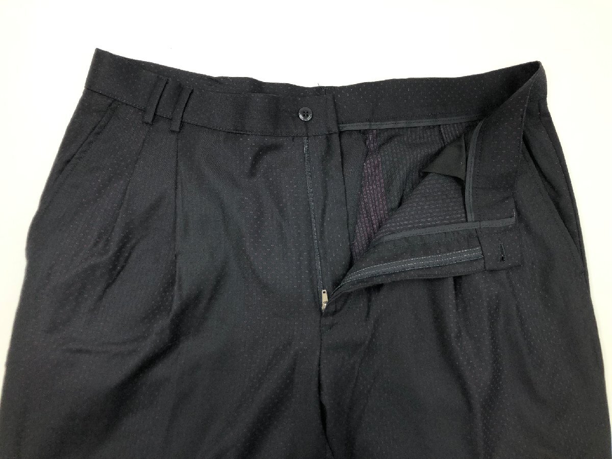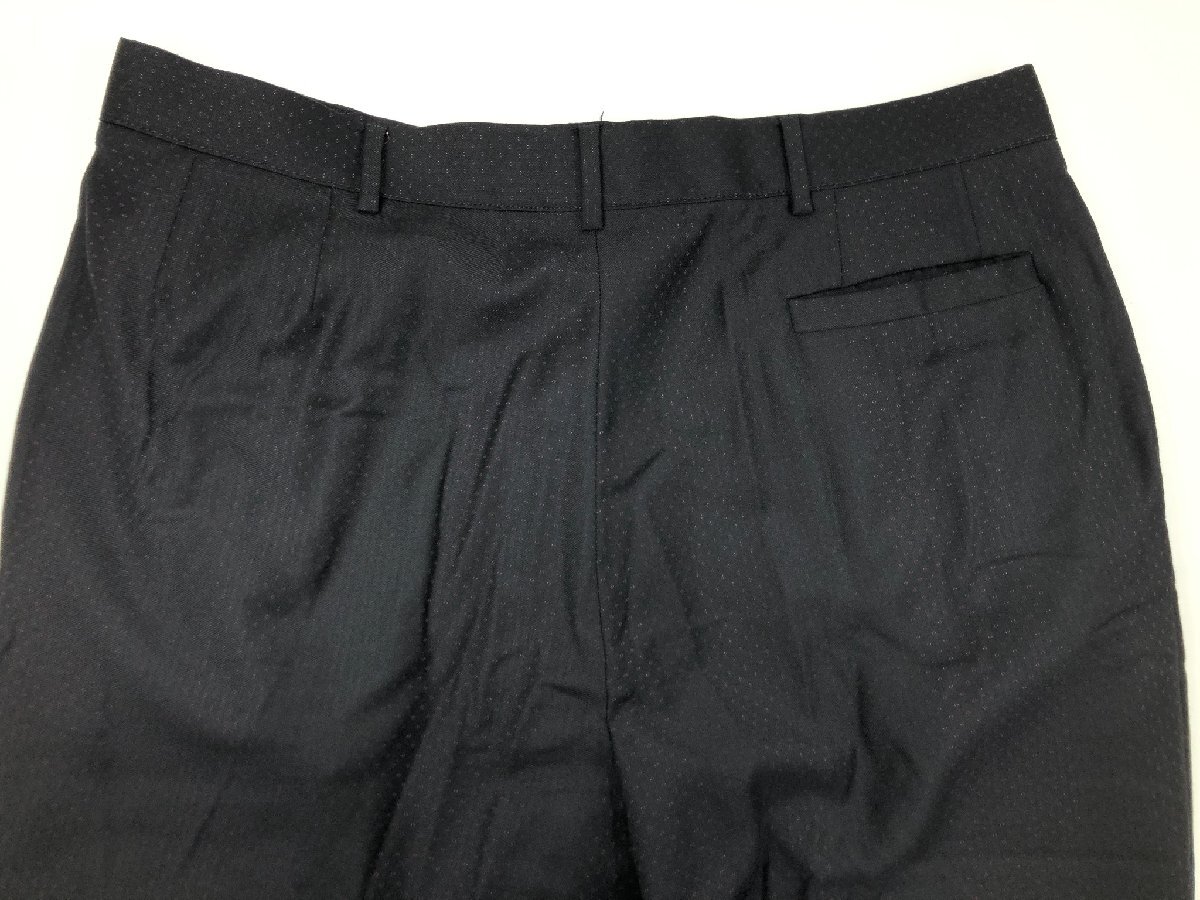 ・スラックス・・・ウエスト実寸約94センチ(4センチ出し、4センチ詰め可能)、股上約32センチ、渡り幅約39センチ、股下約81~82センチ、総丈約112センチ、裾幅約22.5センチ、シングル仕上げ(最大でプラス4センチ長くできます)