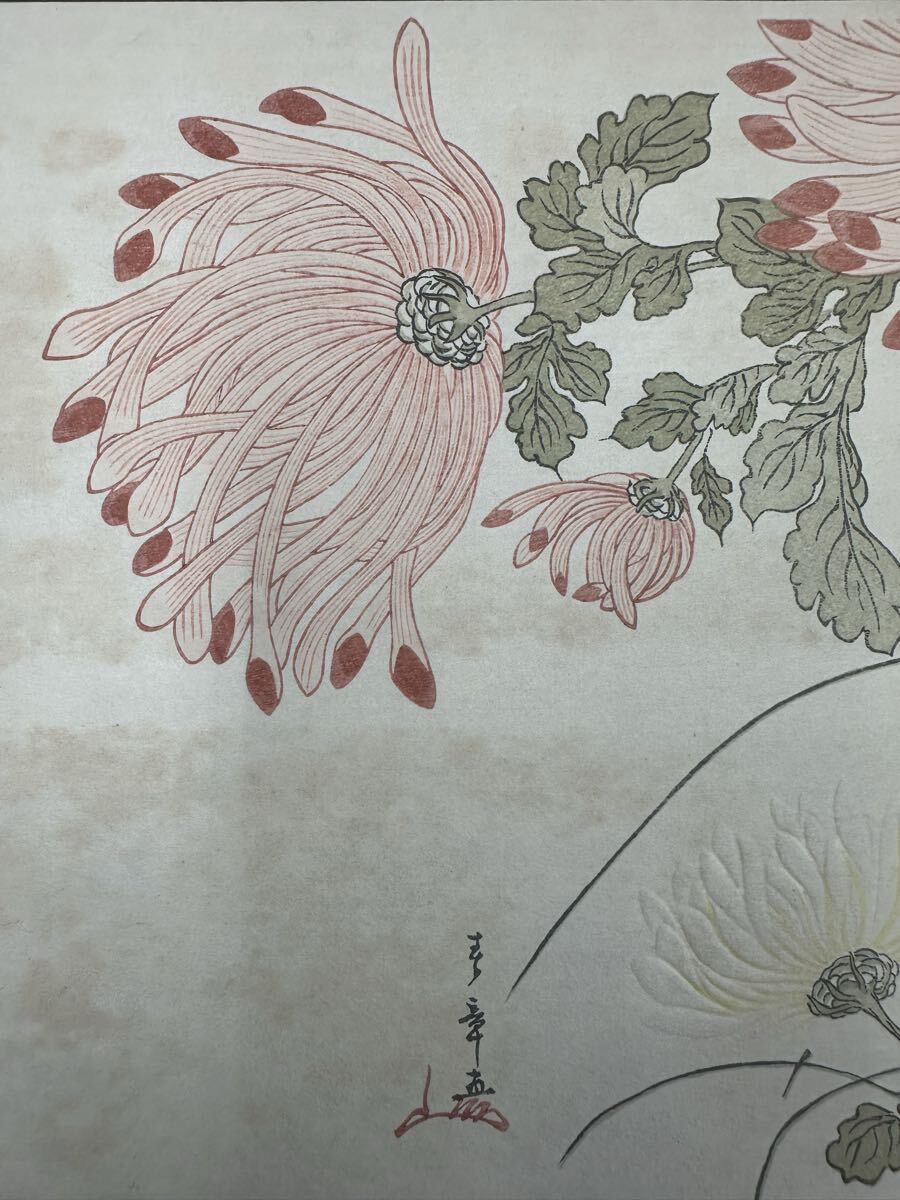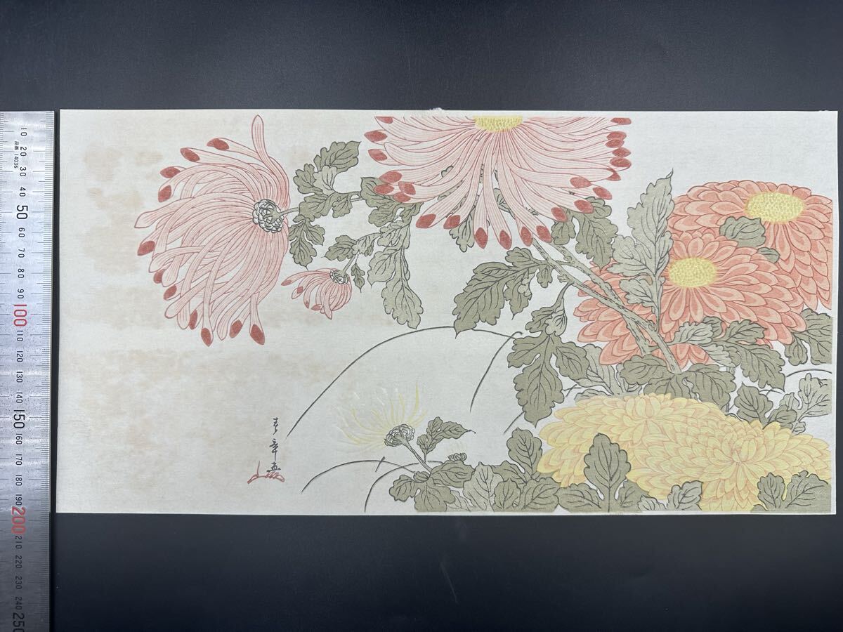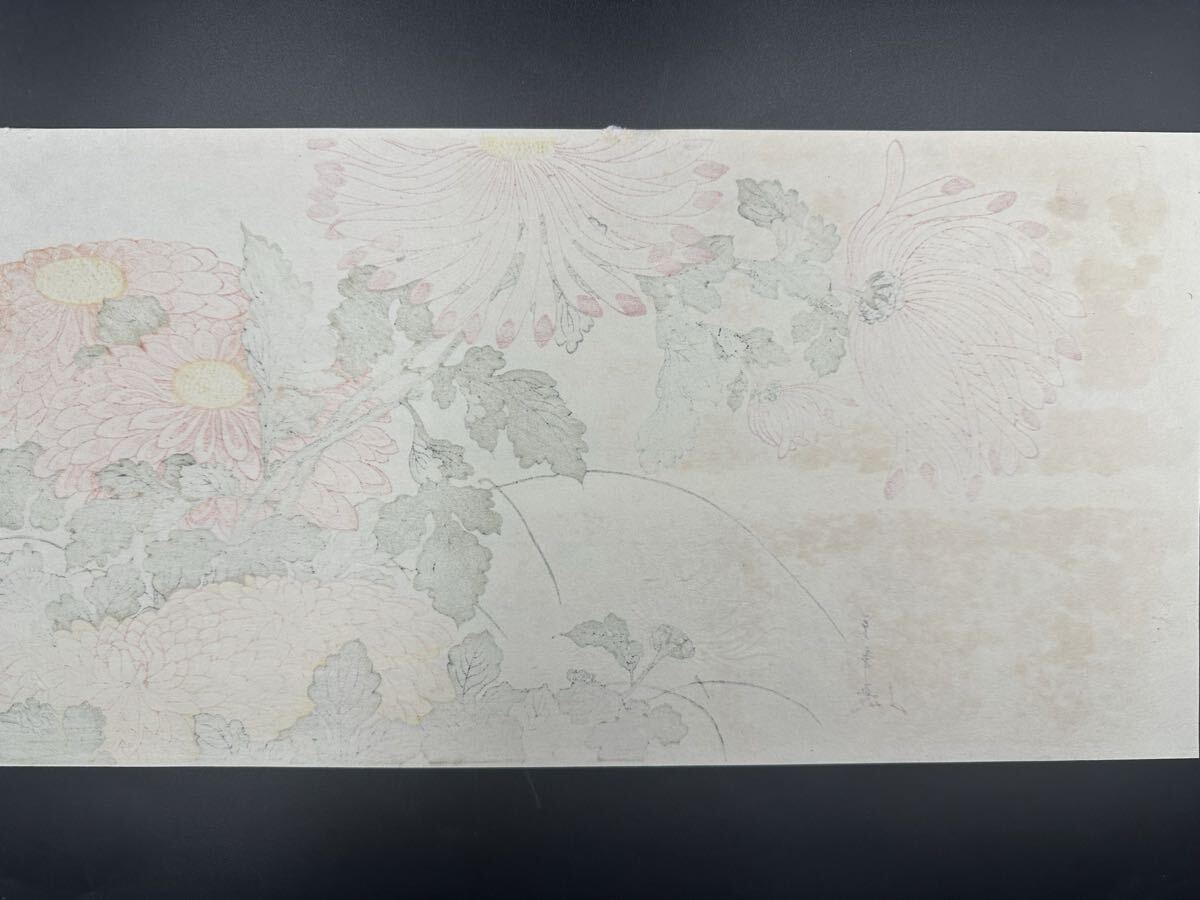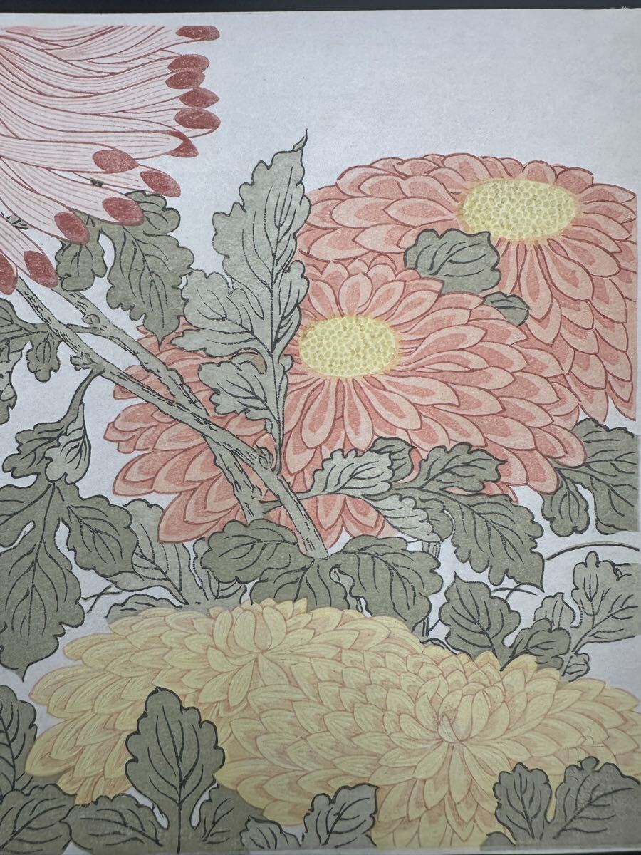 【真作】大正期 浮世絵木版画 勝川春章「菊」花鳥図 大判 錦絵 保存良い