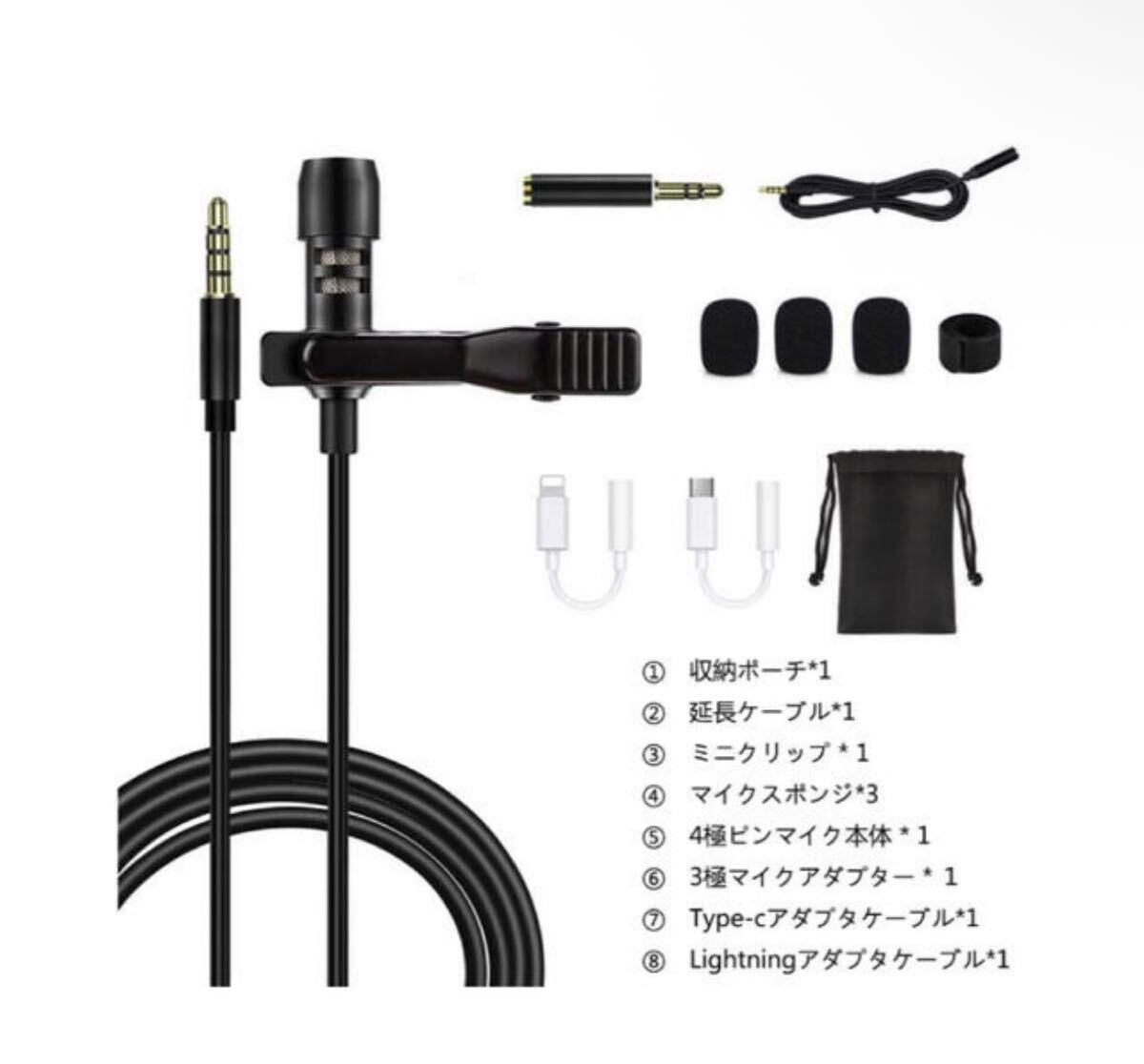 ★【セット内容】4極ピンマイク本体 * 1、マイクスポンジ*3、ミニクリップ * 1、3極マイクアダプター*1、収納ポーチ*1、 Type-cアダプタケーブル*1、Lightningアダプタケーブル*1、延長ケーブル*1。