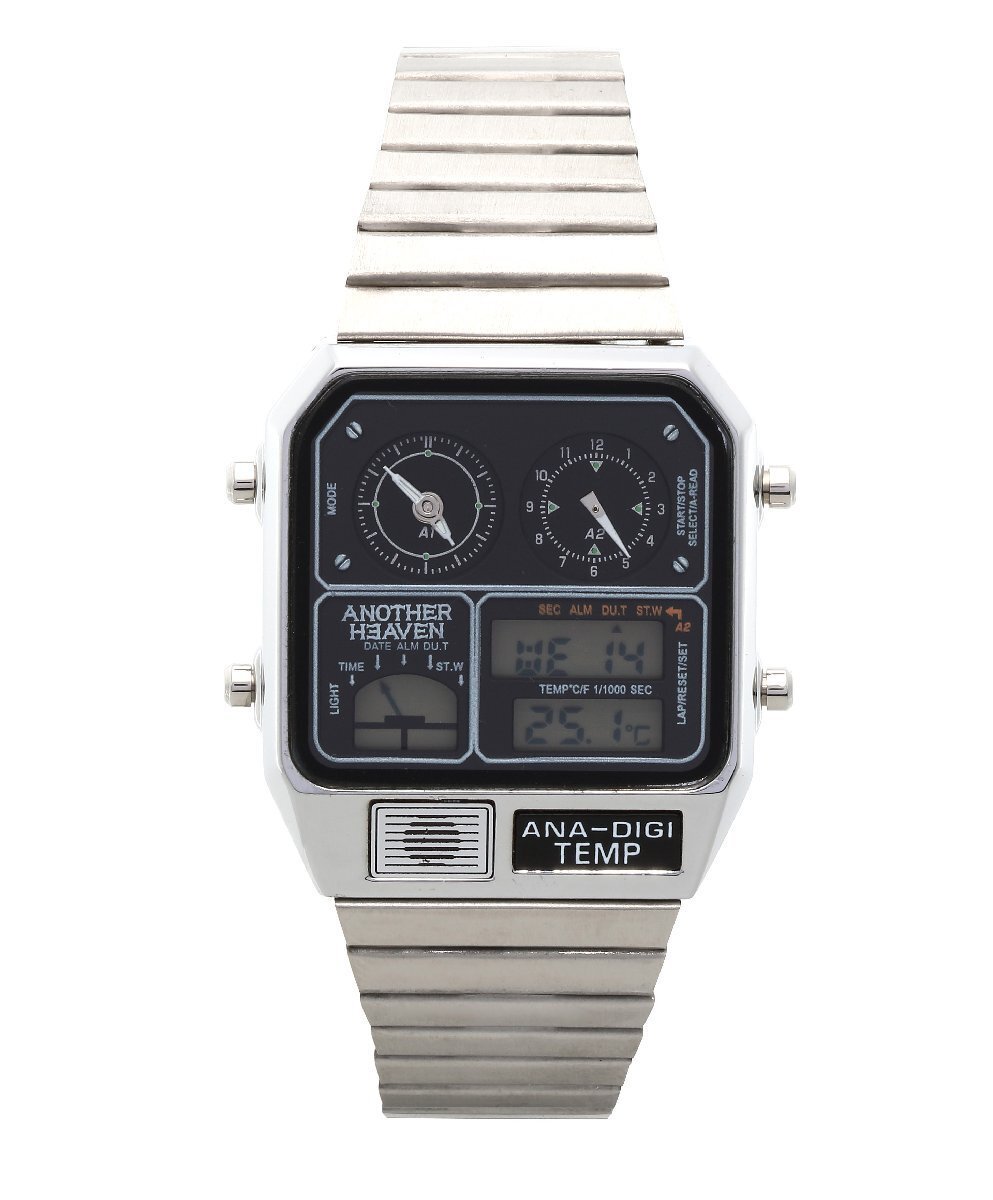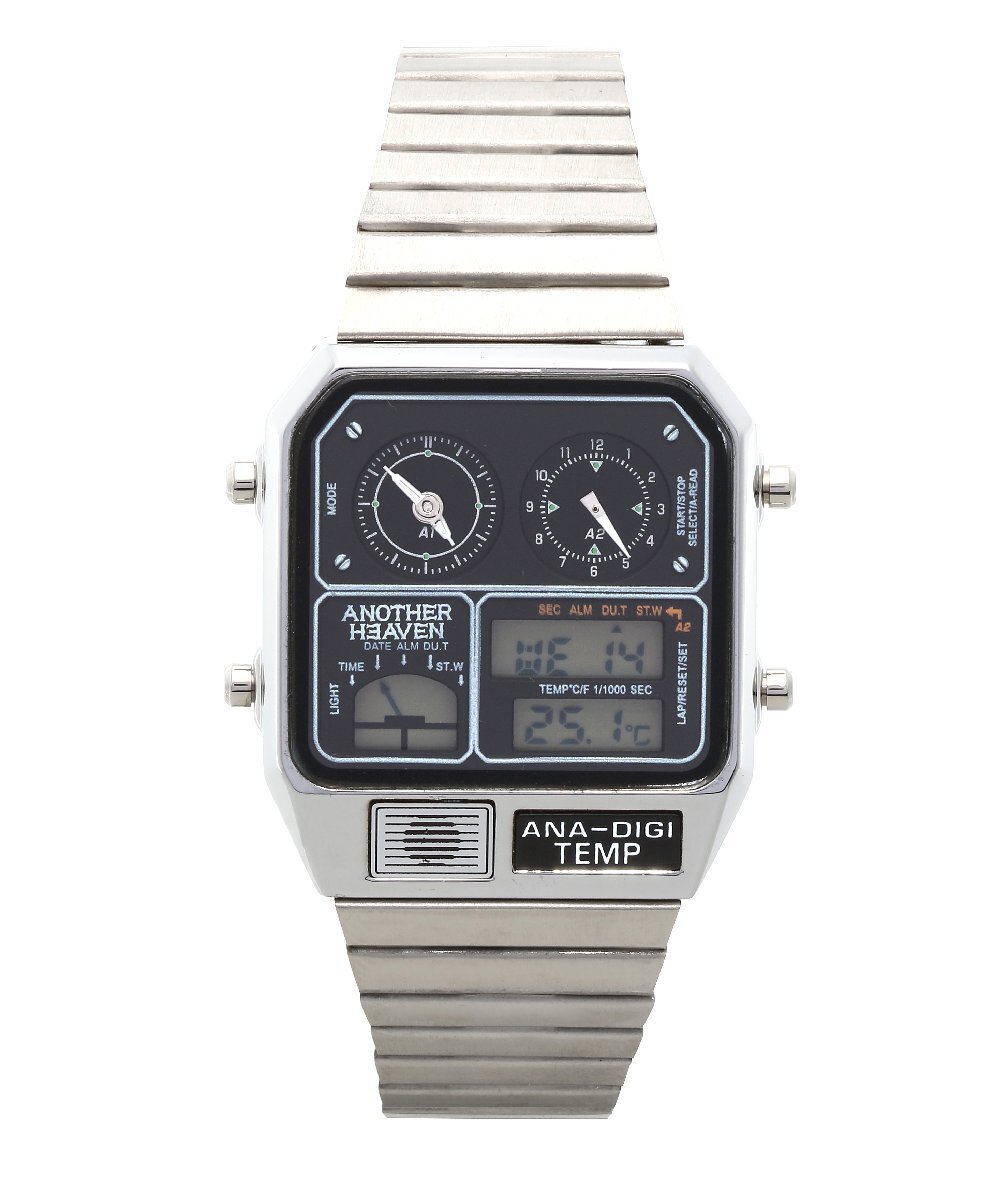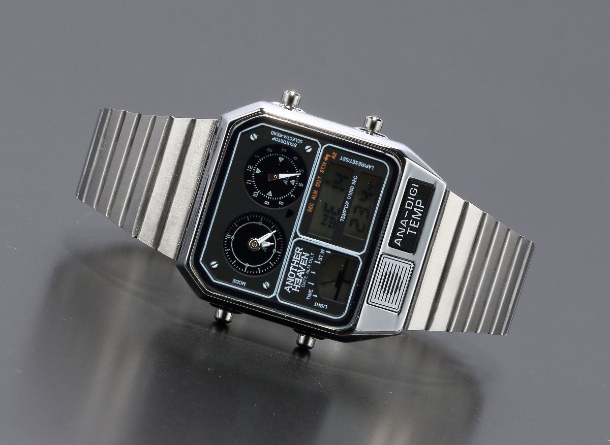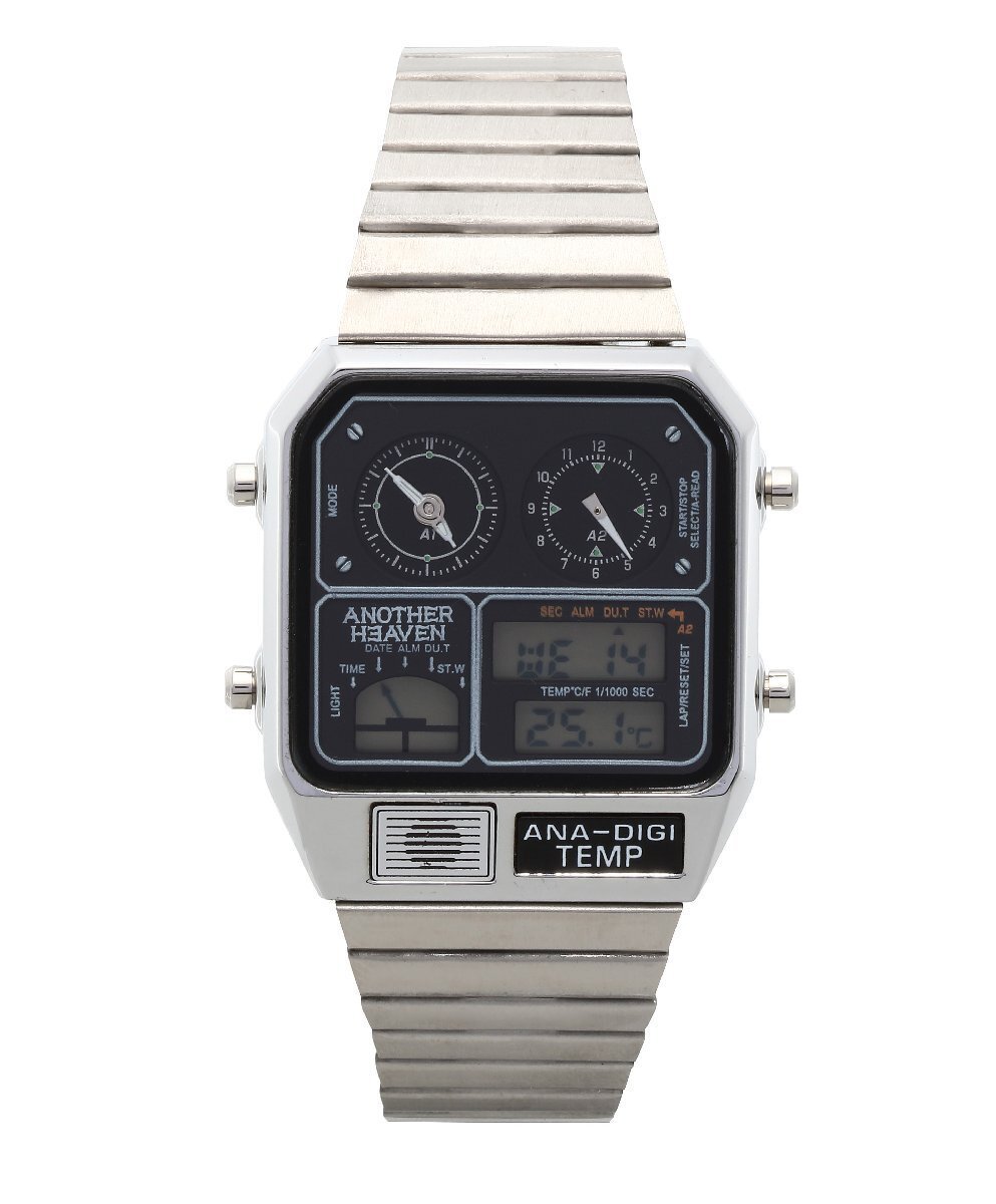 | 1980年代に登場し、当時大ヒットモデルとなったアナデジテンプ。アナログとデジタルを組み合わせたメカニックなデザインだけでなくクロノグラフやアラーム、 温度計、カレンダーなど機能性も抜群。当時、時刻を表示するだけでなく、温度を測るセンサー機能を時計に盛り込み「ニューサイエンス」 の分野を切り拓いたといわれた話題のモデルの再登場。レトロフィューチャー好きにはたまらない時計です。 ↓下記日本語説明書になりますのでご利用下さい。 日本語説明書 ブランド:Another Heaven 素材:ケースステンレススチール 素材:ベルトステンレススチール(スライド式) 風防クリスタルガラス サイズ(縦×横×厚)約35.5×31.5×8mm かん幅約18mm ベルト腕周り約13.5-20cm 重さ約53g 仕様日常生活用防水 精度:平均月差±15秒 クロノグラフ(1/1000秒・12時間計) 日付・曜日表示 日付早修正機能 12/24時間表示切替機能 デュアルタイム機能 カレンダー月末無修正機能 電池寿命切れ予告機能 温度計 アラーム 時報 ライト ※環境問題への取り組みの一環として、取扱説明書は電子化となりました。 |
