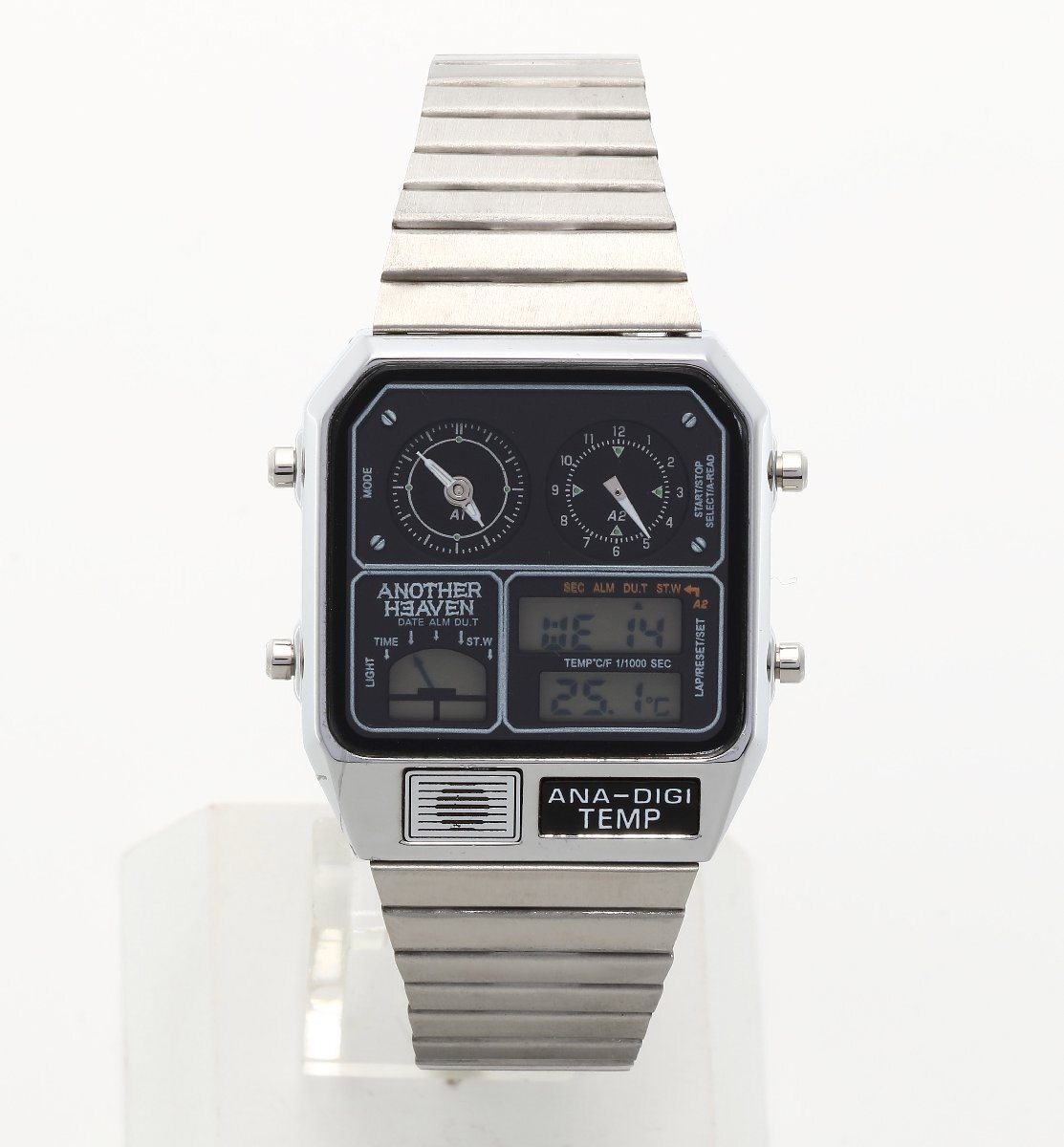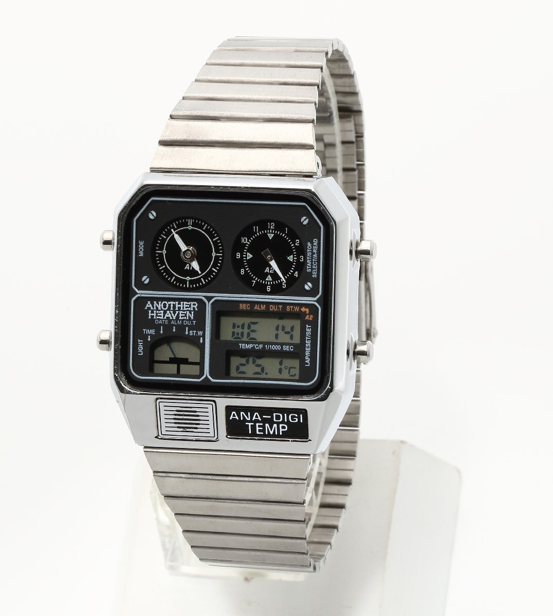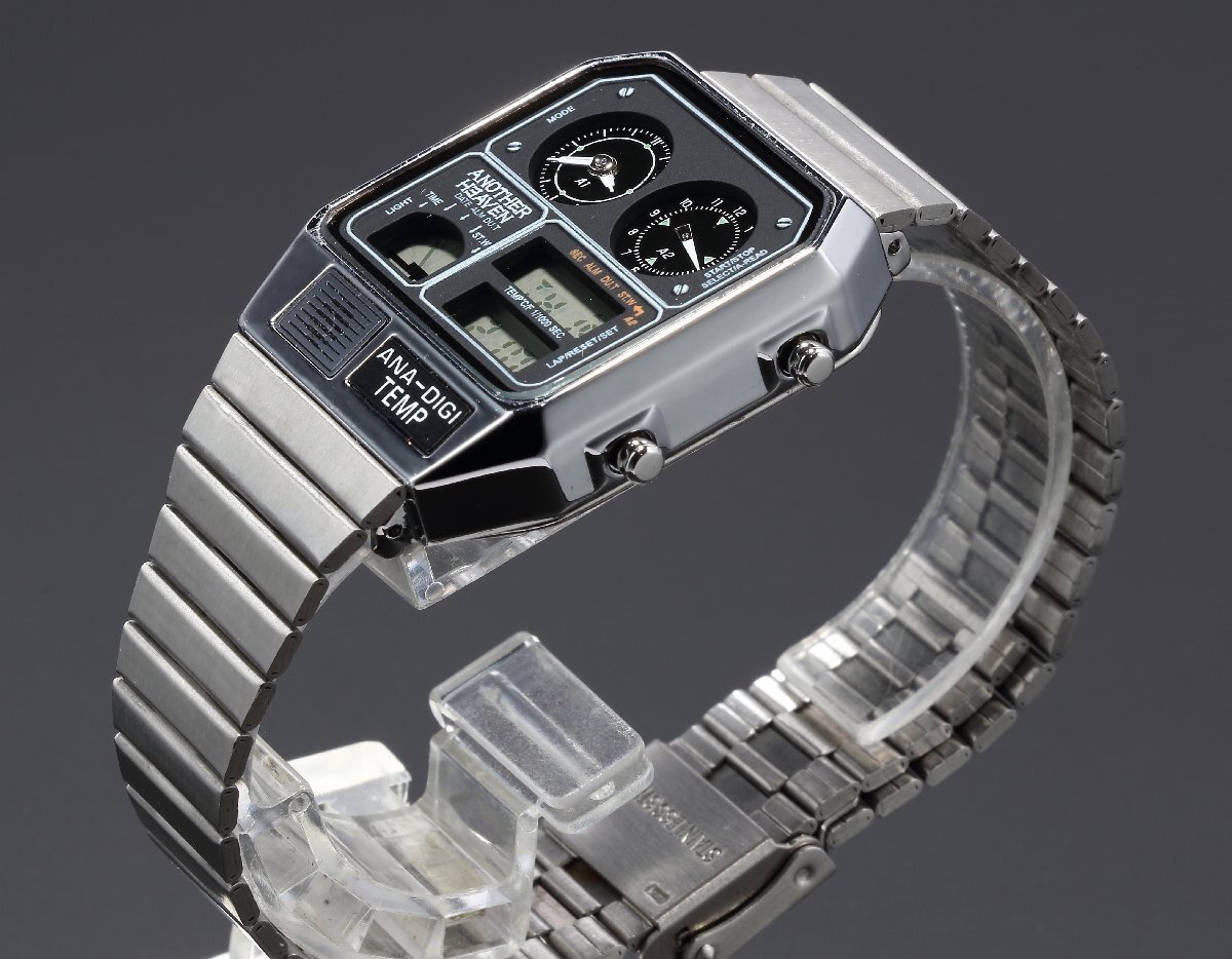 | 1980年代に登場し、当時大ヒットモデルとなったアナデジテンプ。アナログとデジタルを組み合わせたメカニックなデザインだけでなくクロノグラフやアラーム、 温度計、カレンダーなど機能性も抜群。当時、時刻を表示するだけでなく、温度を測るセンサー機能を時計に盛り込み「ニューサイエンス」 の分野を切り拓いたといわれた話題のモデルの再登場。レトロフィューチャー好きにはたまらない時計です。 ↓下記日本語説明書になりますのでご利用下さい。 日本語説明書 ブランド:Another Heaven 素材:ケースステンレススチール 素材:ベルトステンレススチール(スライド式) 風防クリスタルガラス サイズ(縦×横×厚)約35.5×31.5×8mm かん幅約18mm ベルト腕周り約13.5-20cm 重さ約53g 仕様日常生活用防水 精度:平均月差±15秒 クロノグラフ(1/1000秒・12時間計) 日付・曜日表示 日付早修正機能 12/24時間表示切替機能 デュアルタイム機能 カレンダー月末無修正機能 電池寿命切れ予告機能 温度計 アラーム 時報 ライト ※環境問題への取り組みの一環として、取扱説明書は電子化となりました。 |