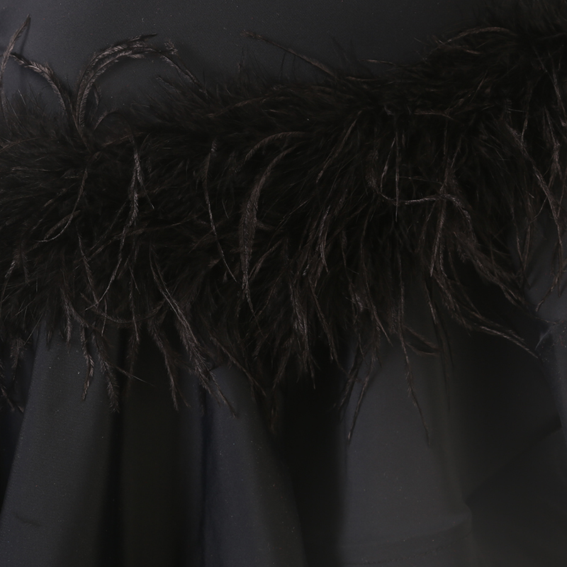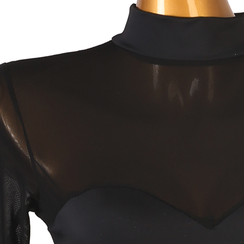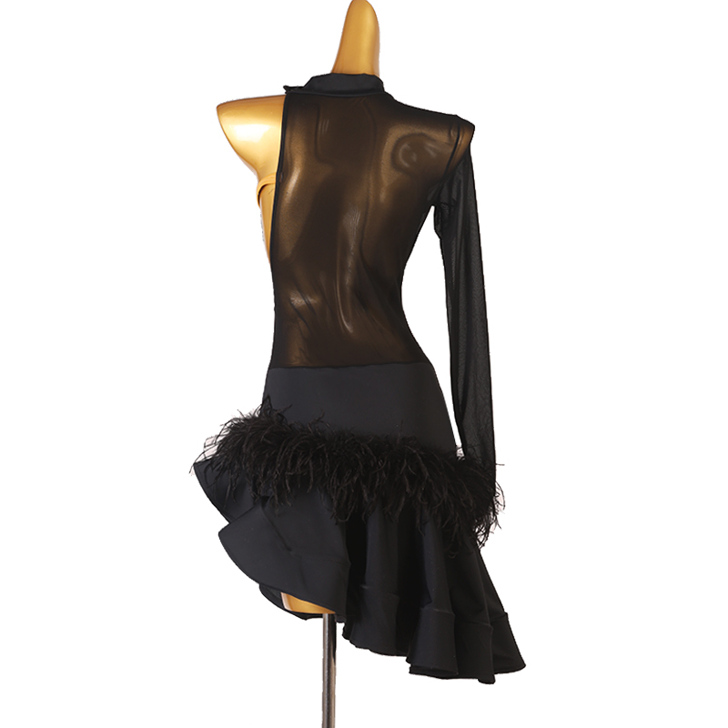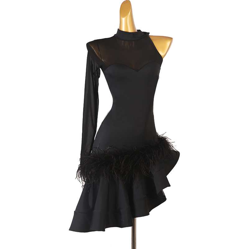 新作 レディース社交ダンス衣装 ラテンドレス サイズ調整対応 ファー飾り ブラック サイズS~XXL 片袖
