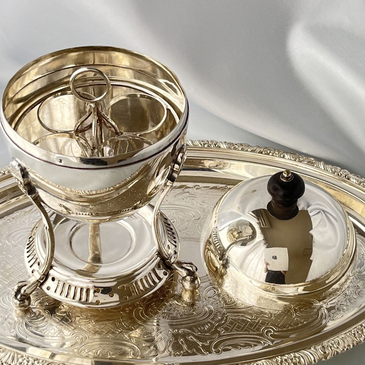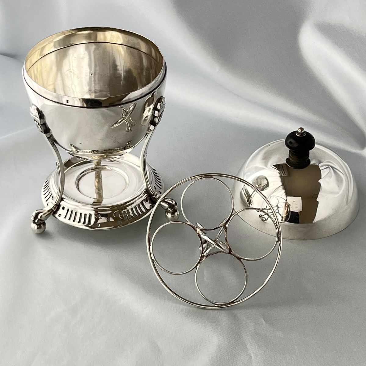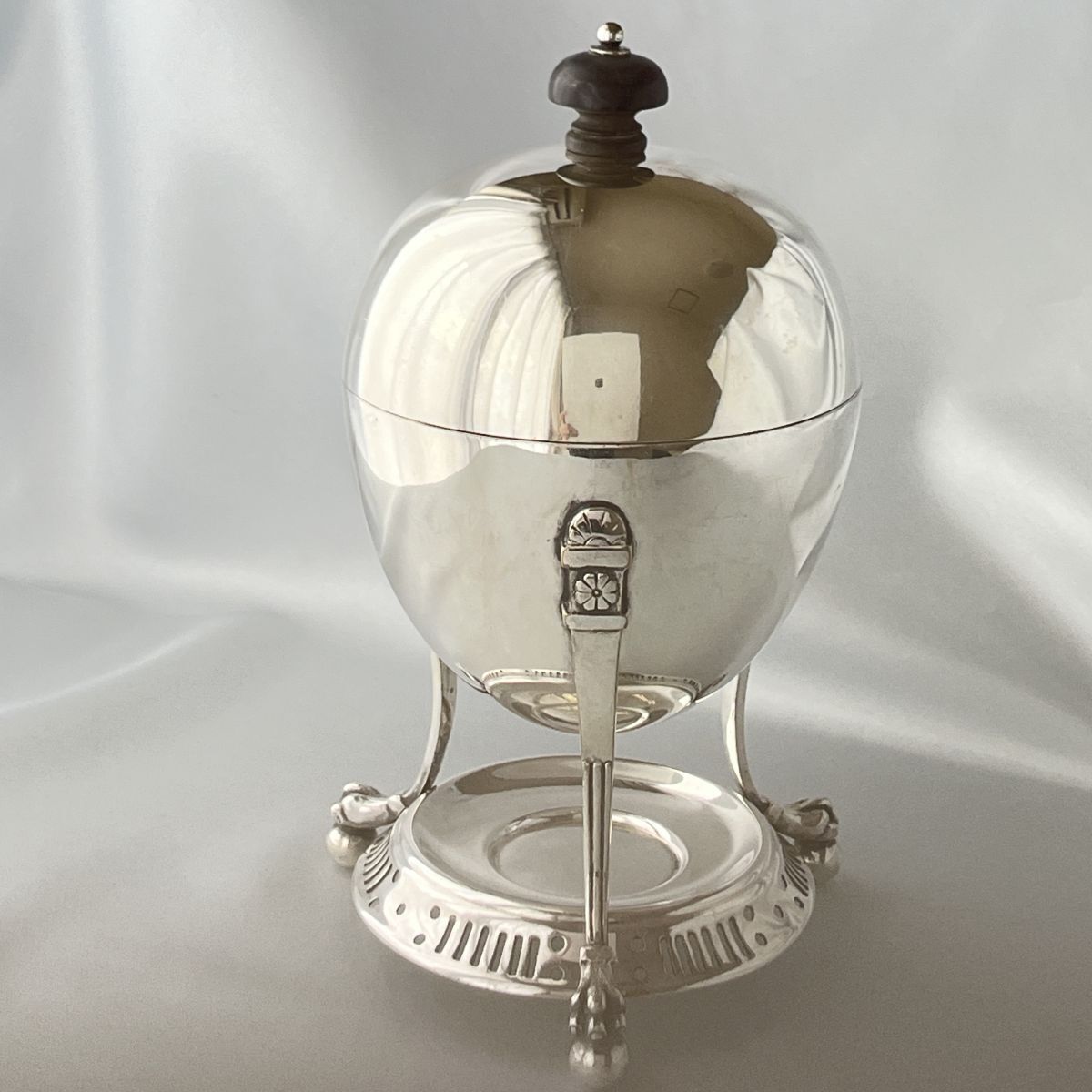 シルバープレート(純銀メッキ)製、蓋つまみは樹脂製になります。