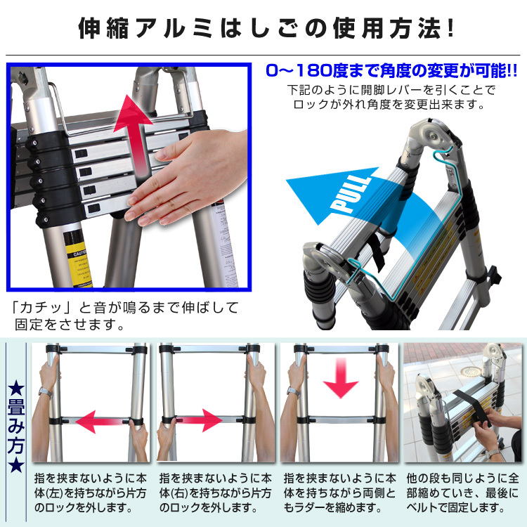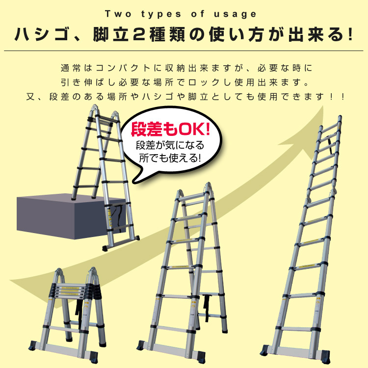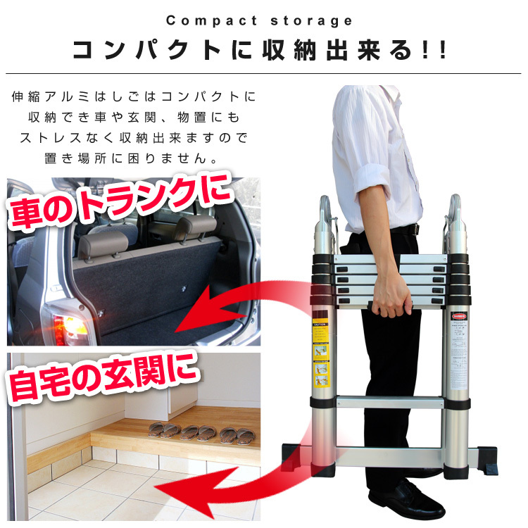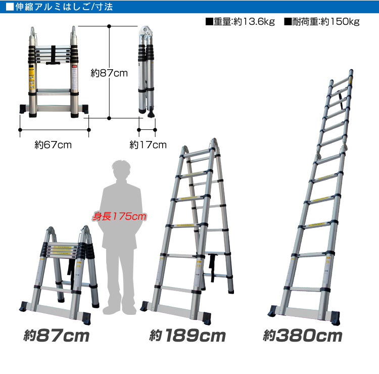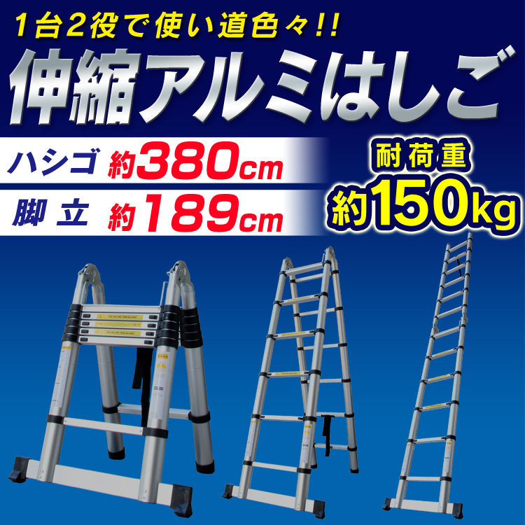 最長3.8mまで伸びるはしご。 伸縮自在で使用時には1段ずつの引き伸ばし可能! 必要な高さでロックできます。 収納時の高さはなんと87cm! 軽自動車でも運べるコンパクトサイズ! 2階の外壁、窓、屋根のお掃除はもちろん、電球交換など幅広く活躍! 私生活に不可欠なはしごです! 段落ちしない安全ロック付。 【仕様】 最長:380cm(脚立時:189cm) 収納時:87×67×17cm 質量:13.6kg 最大耐荷重:150kg 素材:アルミ(連結部分:スチール) ・海外製品で、簡易梱包での輸入のため風防に擦れや多少の小キズなどがある場合がございますが、商品自体には問題ありませんのでご了承下さい。 ・仕様・デザインは改良のため予告なく変更することがあります。 |