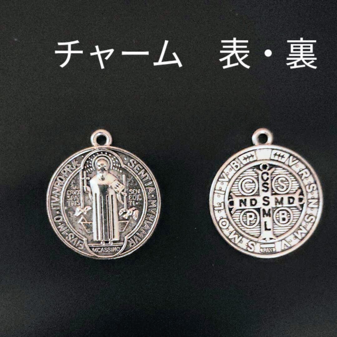 ヴィンテージ風なフェザーとカトリックコインを型どったチャーム、真鍮製ナスカン2個がついています。