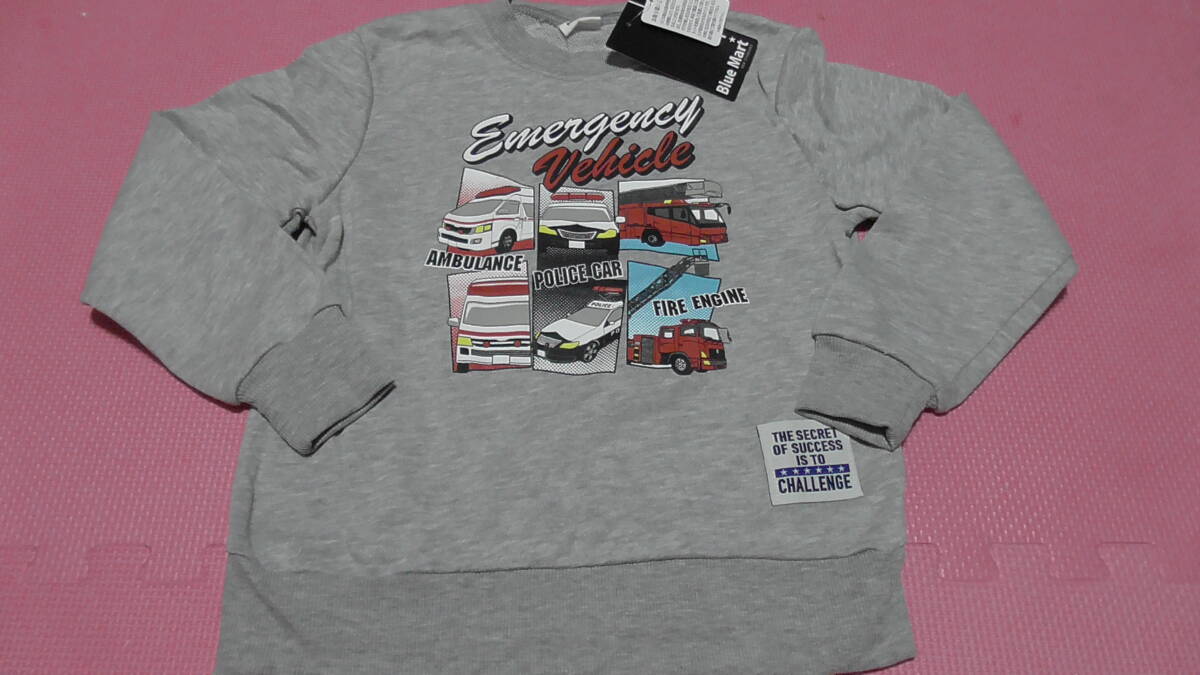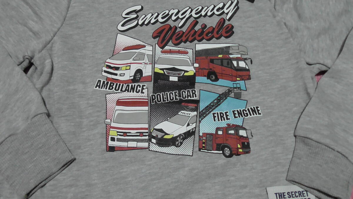 新品 130 働く車柄 長袖トレーナー グレー パトカー 消防車 救急車 警察 パトロールカー 緊急車両 兄弟 男の子 秋物 春物 120~ 送料無料