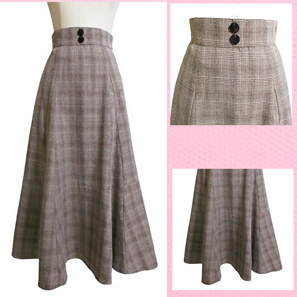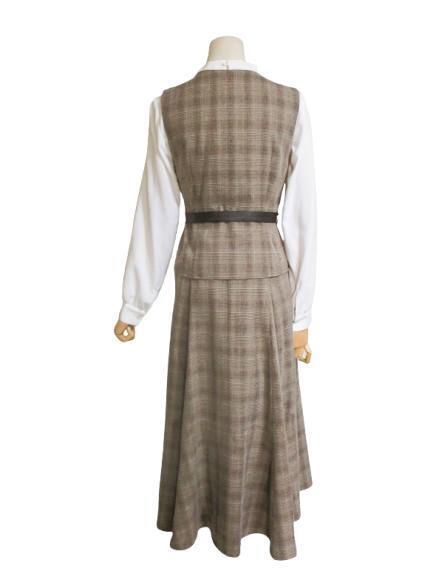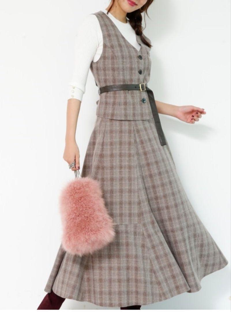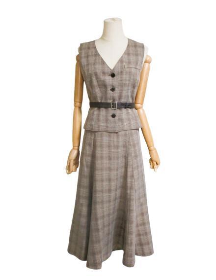 クラシカルなチェック柄が上品に映えるマイストラーダのふんわり裾広がりのフレアスカートに同じ生地のベストをコンビにしたワンピース風なセットアップ