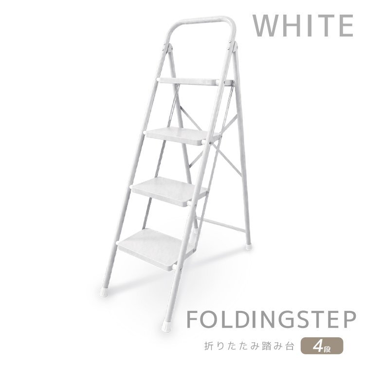 ステップ台 4段脚立 (折りたたみステップ 滑り止め加工) 耐荷重(約): 150kg 段数: 4段タイプ カラー: ホワイト 暮らしに馴染むやさしいカラーの折りたたみステップです。 一家に一台あると便利! 照明器具の交換や、高い位置になる棚から物を取り出すときに便利!! 耐荷重(約)150kg&ワイドステップ!安定感抜群で安心♪ また、滑り止め加工・握りやすい持ち手・脚先グリップで最上段まで簡単に上れます! お部屋や玄関に置いても邪魔にならないスリムサイズ。 折りたためばコンパクトに!手軽に持ち運びできちゃいます☆ |