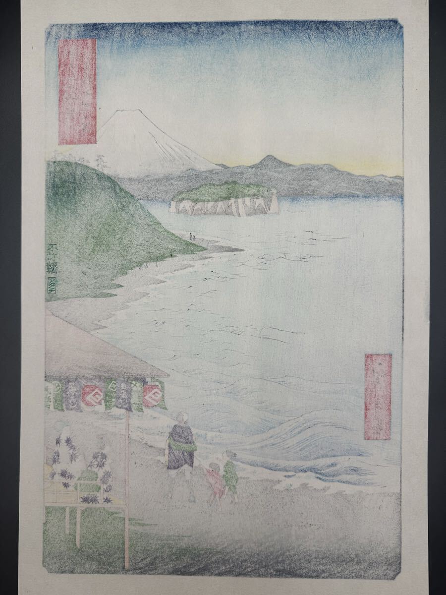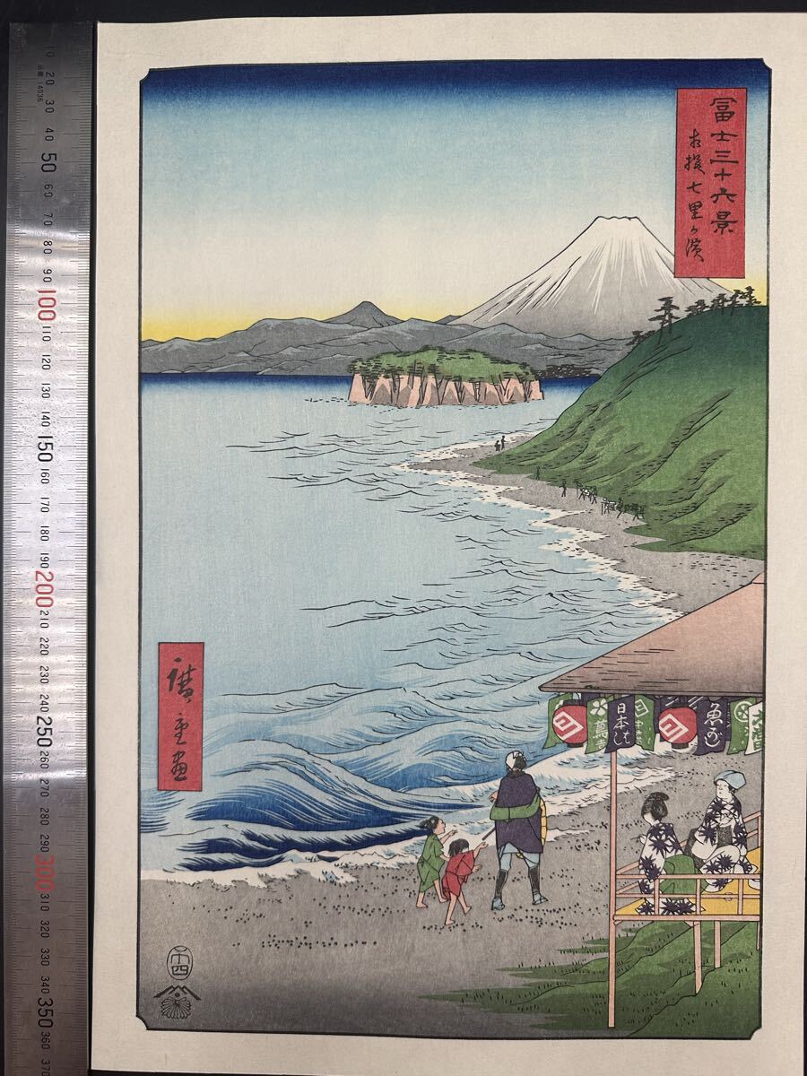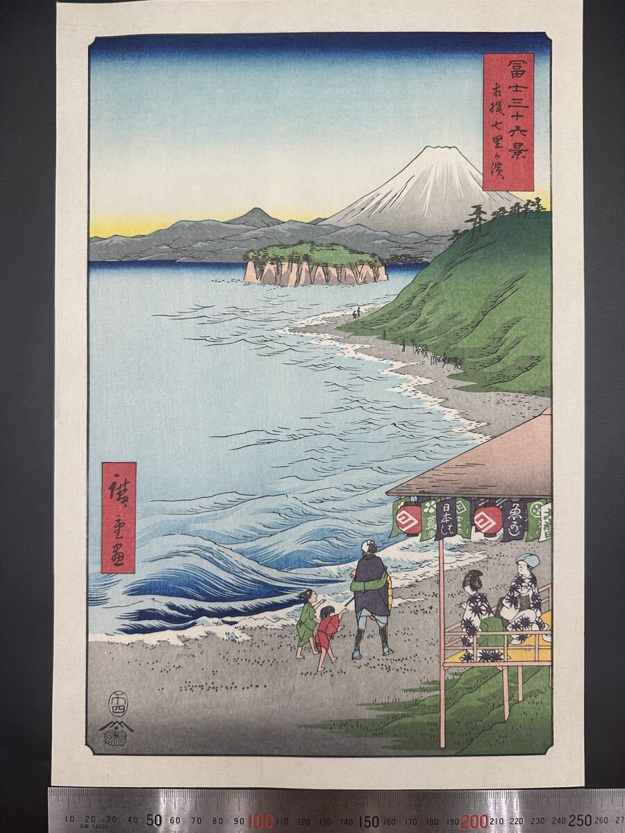 【真作】大正期 浮世絵木版画 歌川広重「冨士三十六景 相模七里か濱」名所絵 大判 錦絵 保存良い 大判