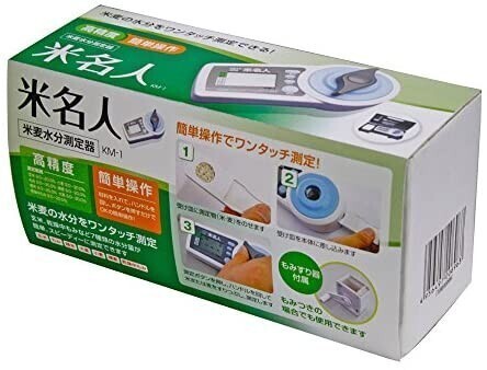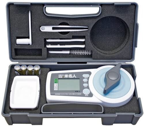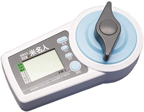 高森コーキ 米麦水分測定器 米名人 KM-1 □商品詳細サイズ:本体/約W190×D100×H72mm、ケース/約W280×D95×H125mm重量:約450g(電池含まず)測定対象:玄米、もみ、精米、大麦、小麦、裸米、乾燥中もみ測定範囲:玄米/9.0~20.0%、もみ/9.0~30.0%、精米/9.0~20.0%、大麦/9.0~30.0%、小麦/9.0~30.0%、裸米/9.0~20.0%、乾燥中もみ/9.0~20.0%測定精度:±0.5%(10~20%、25℃測定時)表示方式:デジタル(最小表示桁0.1%)使用温度範囲:0~40℃