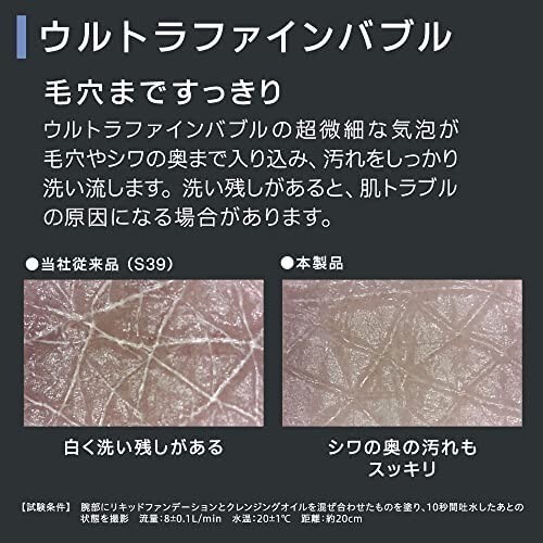 超微細な気泡が毛穴やシワの奥まで入り込み、肌トラブルの原因になる汚れや洗い残しをしっかり洗い流します。
