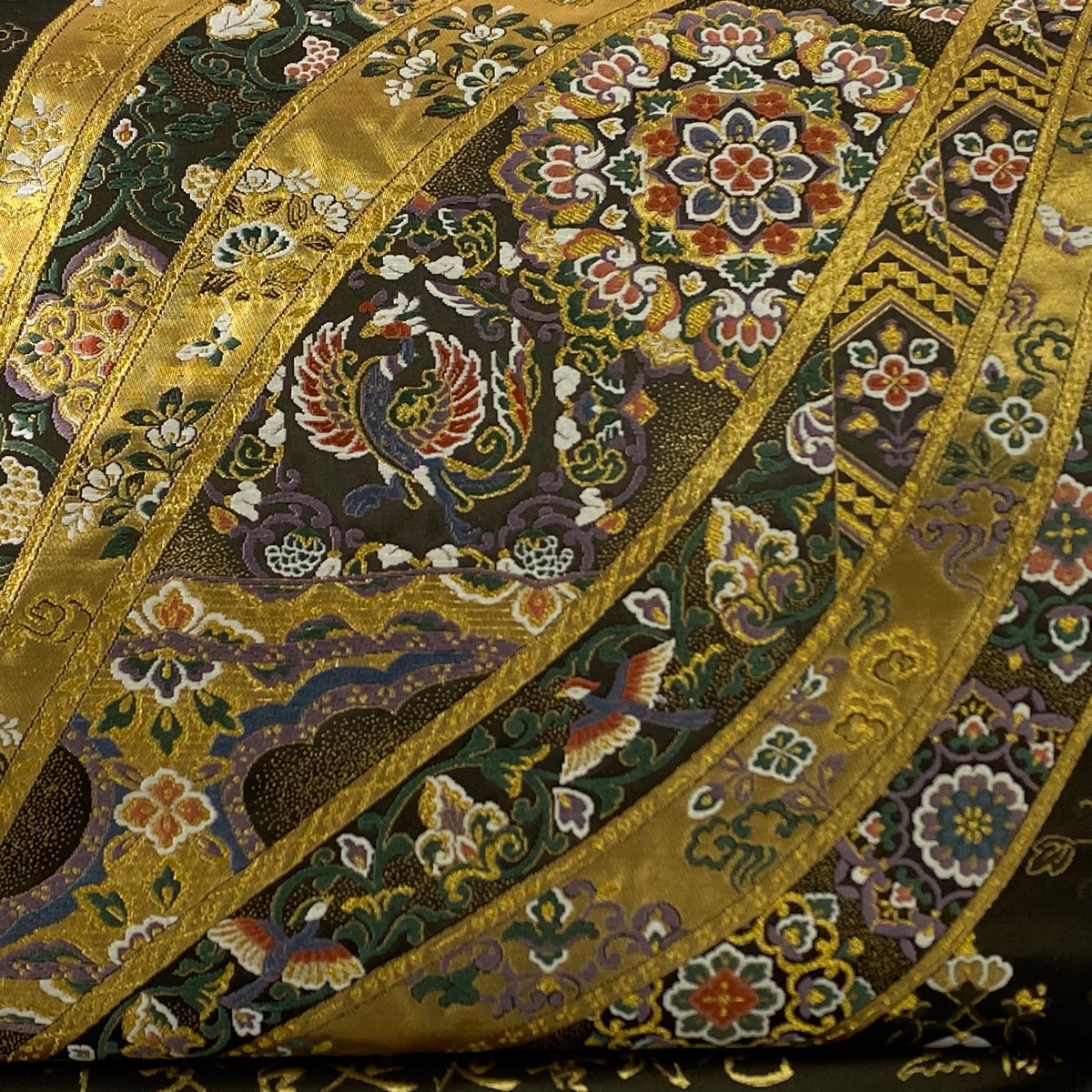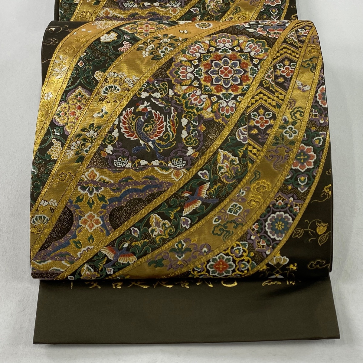 | 袋帯 美品 秀品 証紙 華文 花鳥 金糸 箔 深緑 六通 正絹 【中古】 |