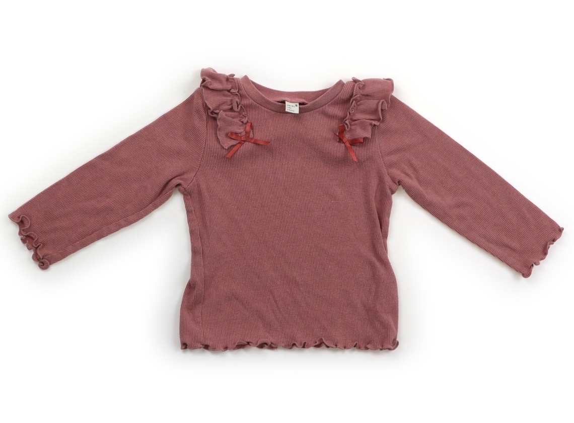 テレコカットソー生地です。毛羽立ちが強めで前衿ぐりに若干黒ずみ感があります。大きな型崩れはありません。袖口、裾はメローロックミシン始末です。肩に共生地フリルが付いています。