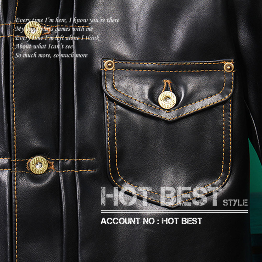 厚み約1.3mmの黒芯ホースハイドで作られたカウボーイタイプのレザージャケットです。UNION MADEドーナツボタンゴールドを採用。