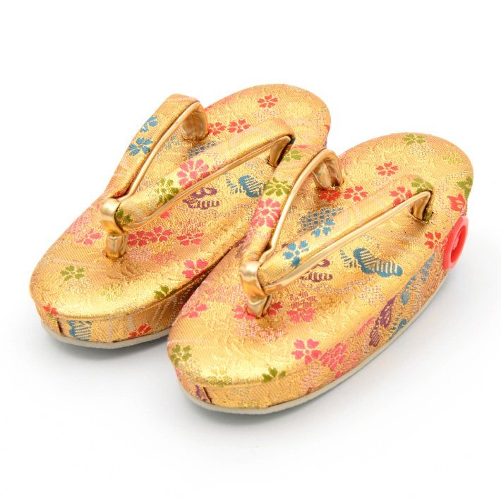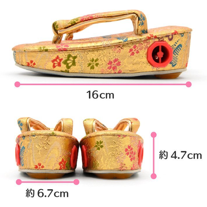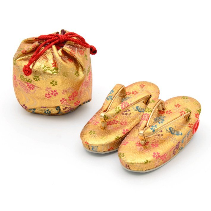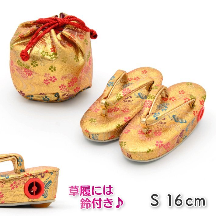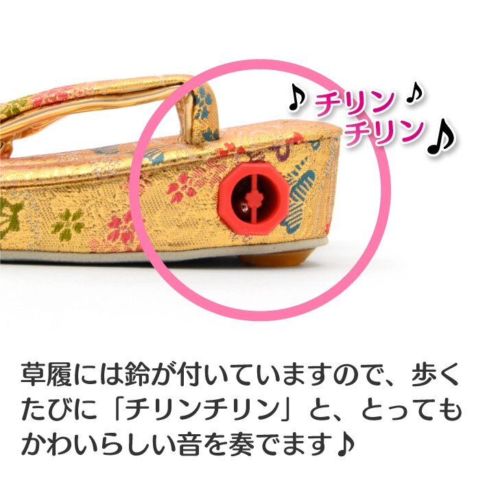 | 商品説明 | カラフルな桜柄が散りばめられた、金色の鈴付き草履巾着セット! 草履には鈴が付いており、歩くたびに「チリンチリン」とかわいらしい音を奏でます♪ お子様がより一層かわいく引き立てられます♪ |