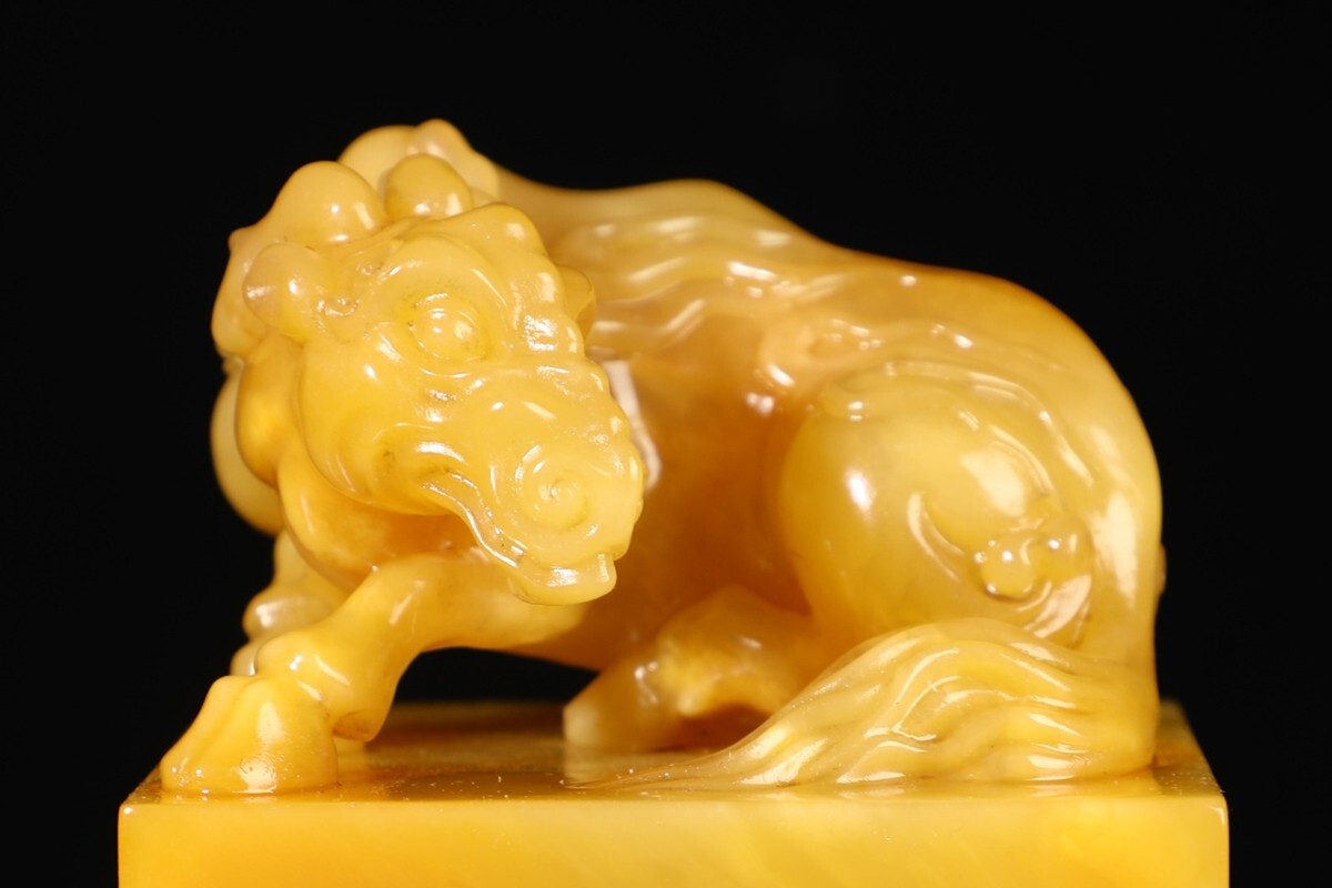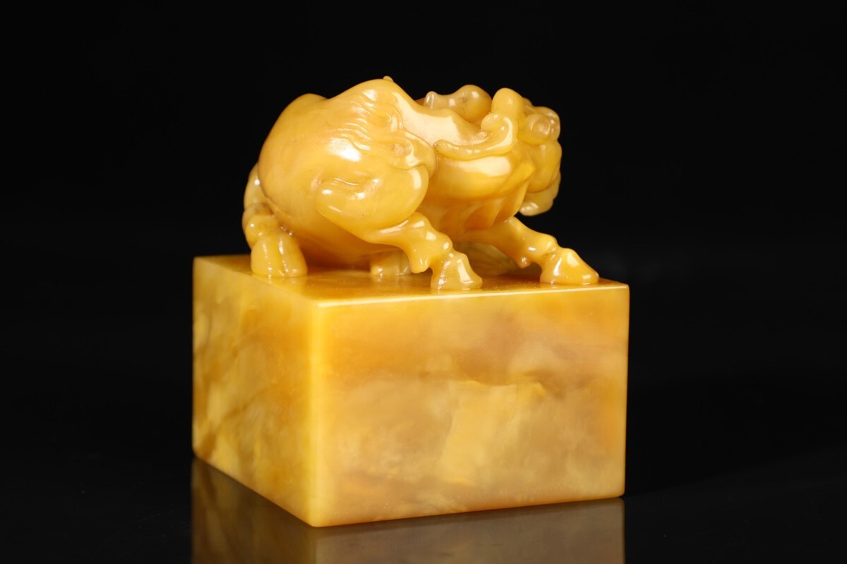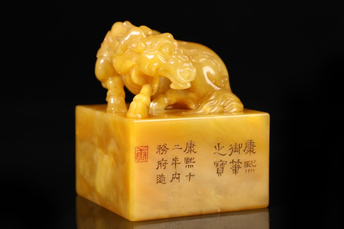「清 康熙十二年内務府造 老寿山石 田黄石彫り 古獣鈕印章 印璽」極細工 擺件 古賞物 中国古美術 旧蔵出