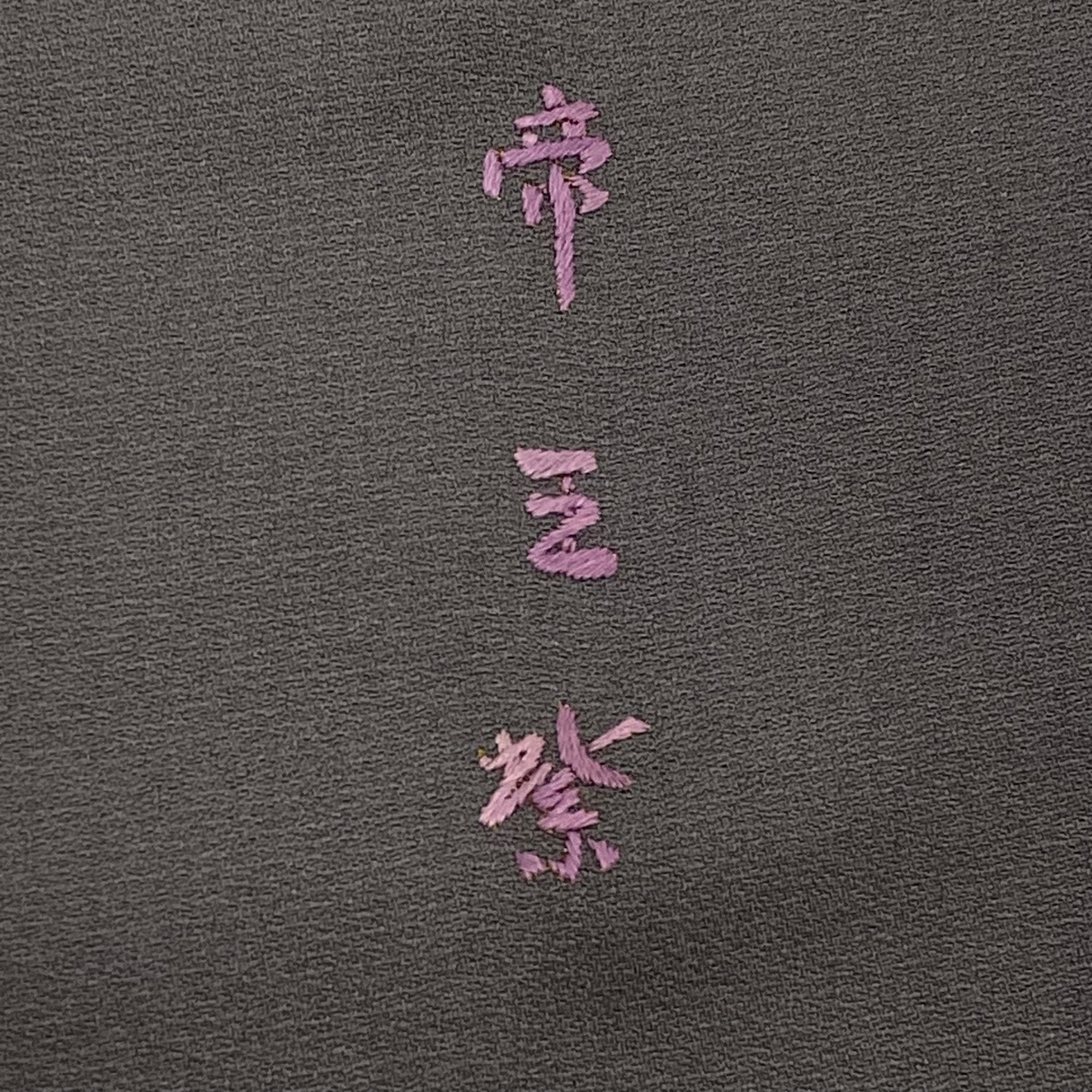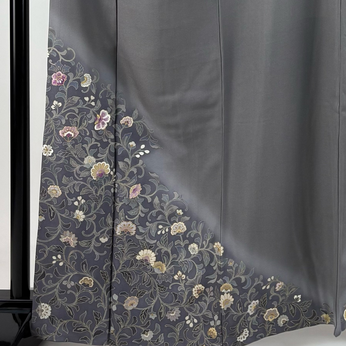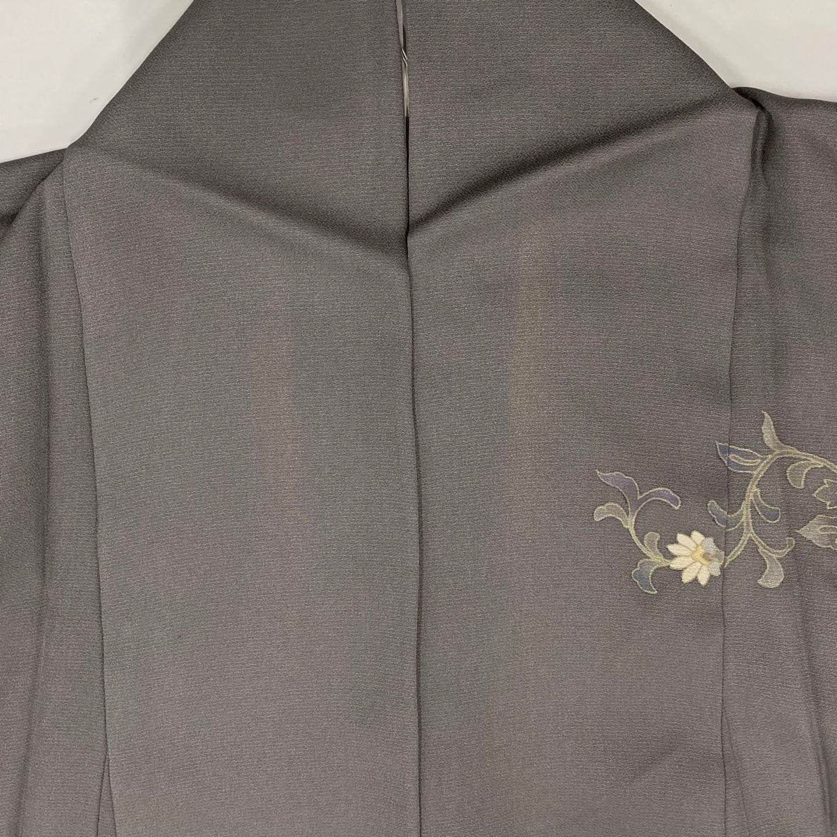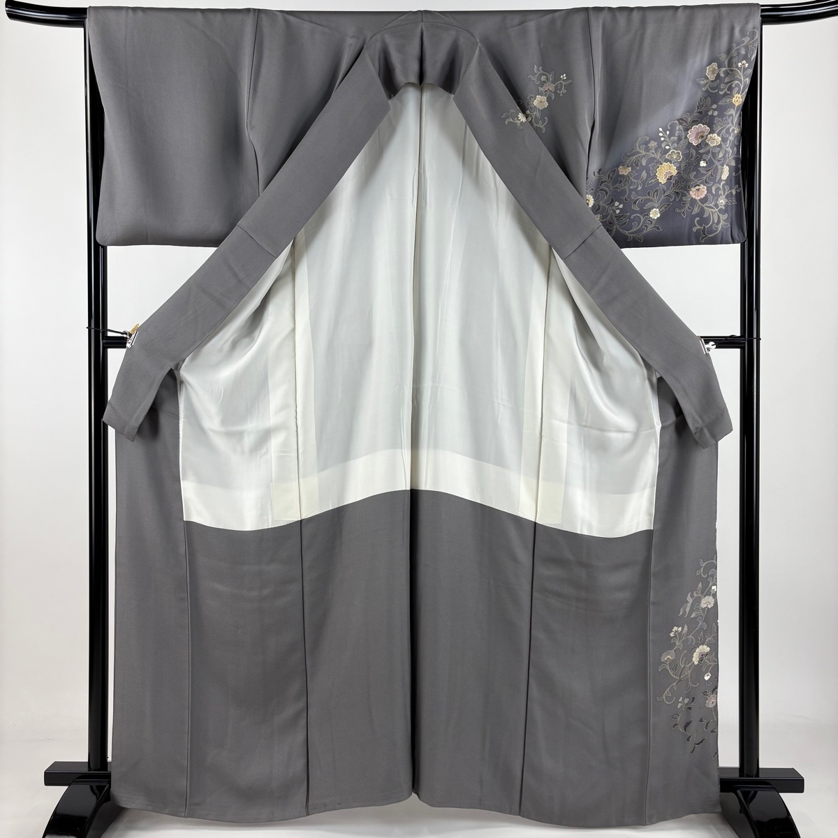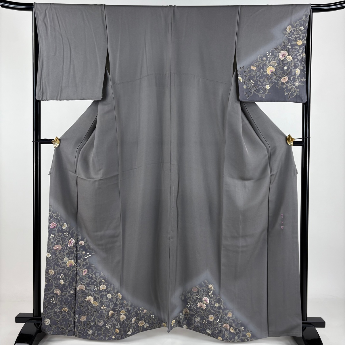 | 訪問着 名品 帝王紫 落款 花唐草 刺繍 金糸 灰色 袷 身丈163.5 裄丈67 M 正絹 【中古】 |