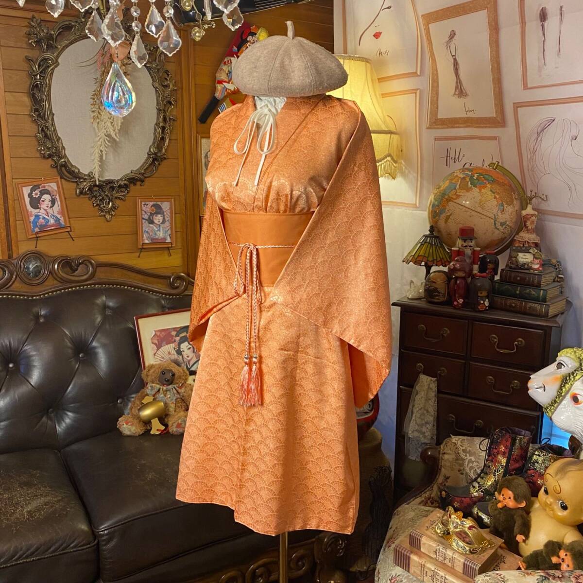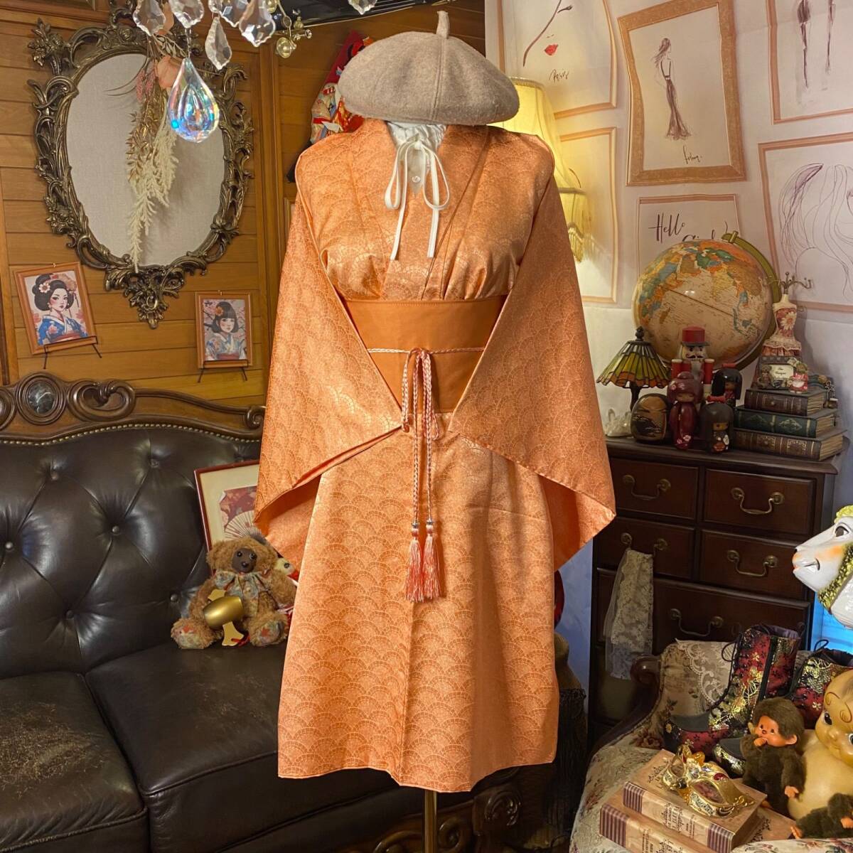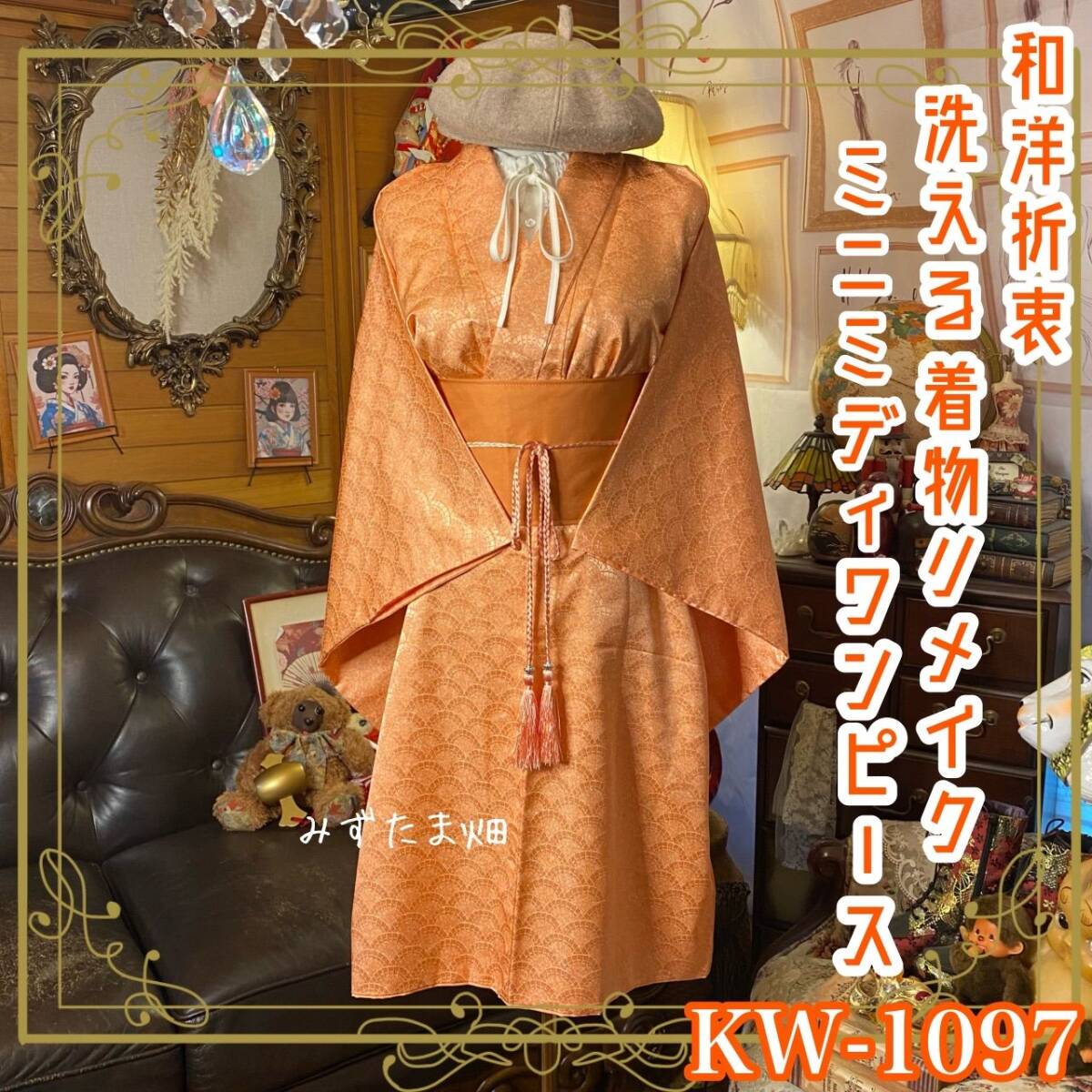 【着物リメイクワンピース ドレス ミニミディ 洗える化繊 + 帯サッシュベルト 和洋折衷 レトロ 古着 ハンドメイド やわらかな杏色(アプリコットオレンジ)KW1097】