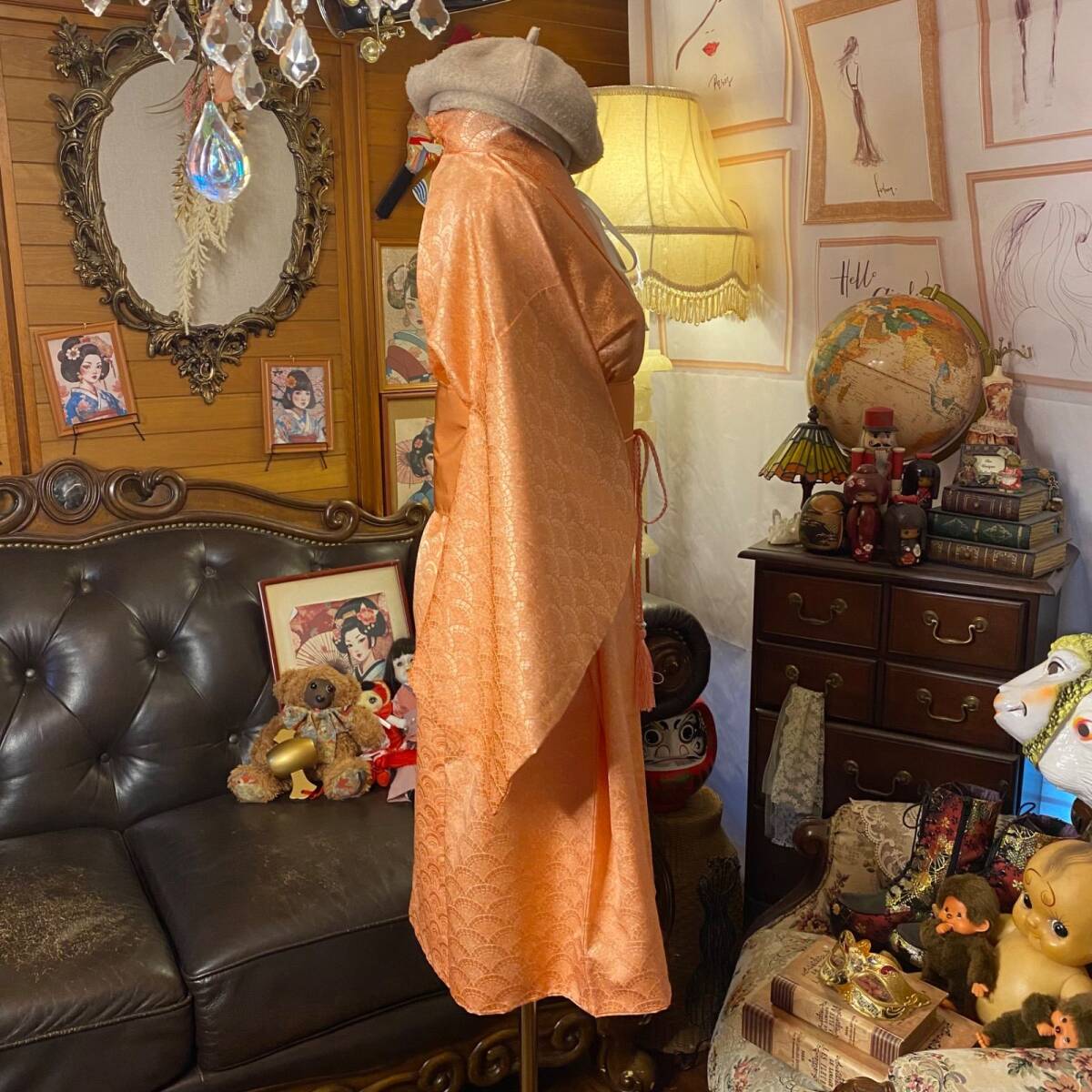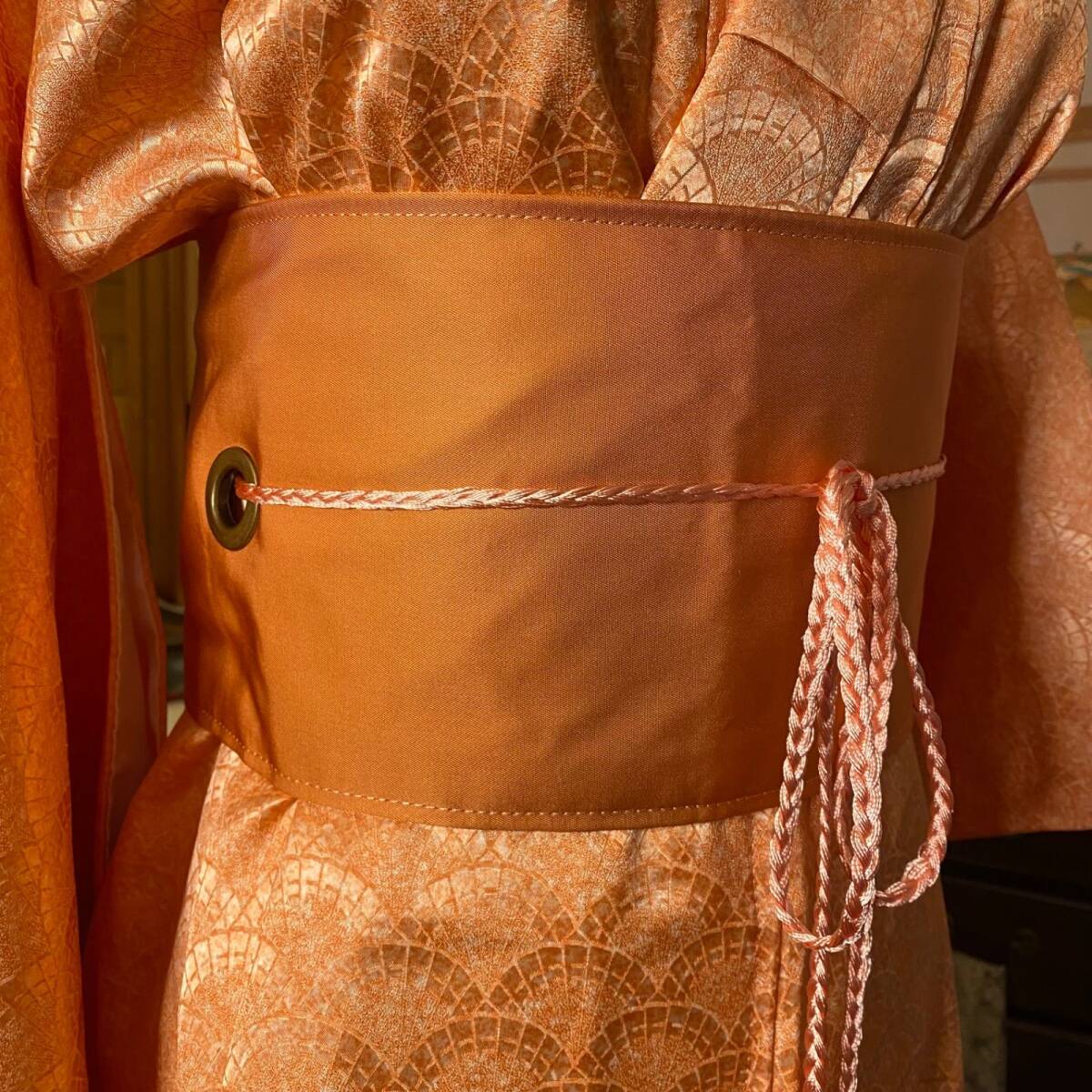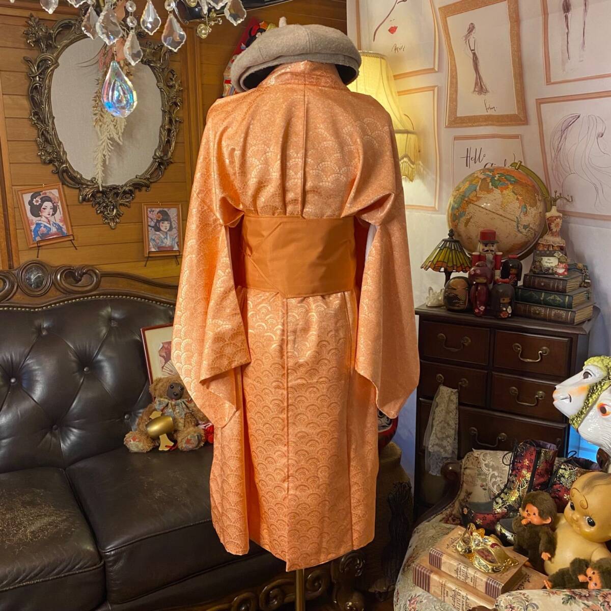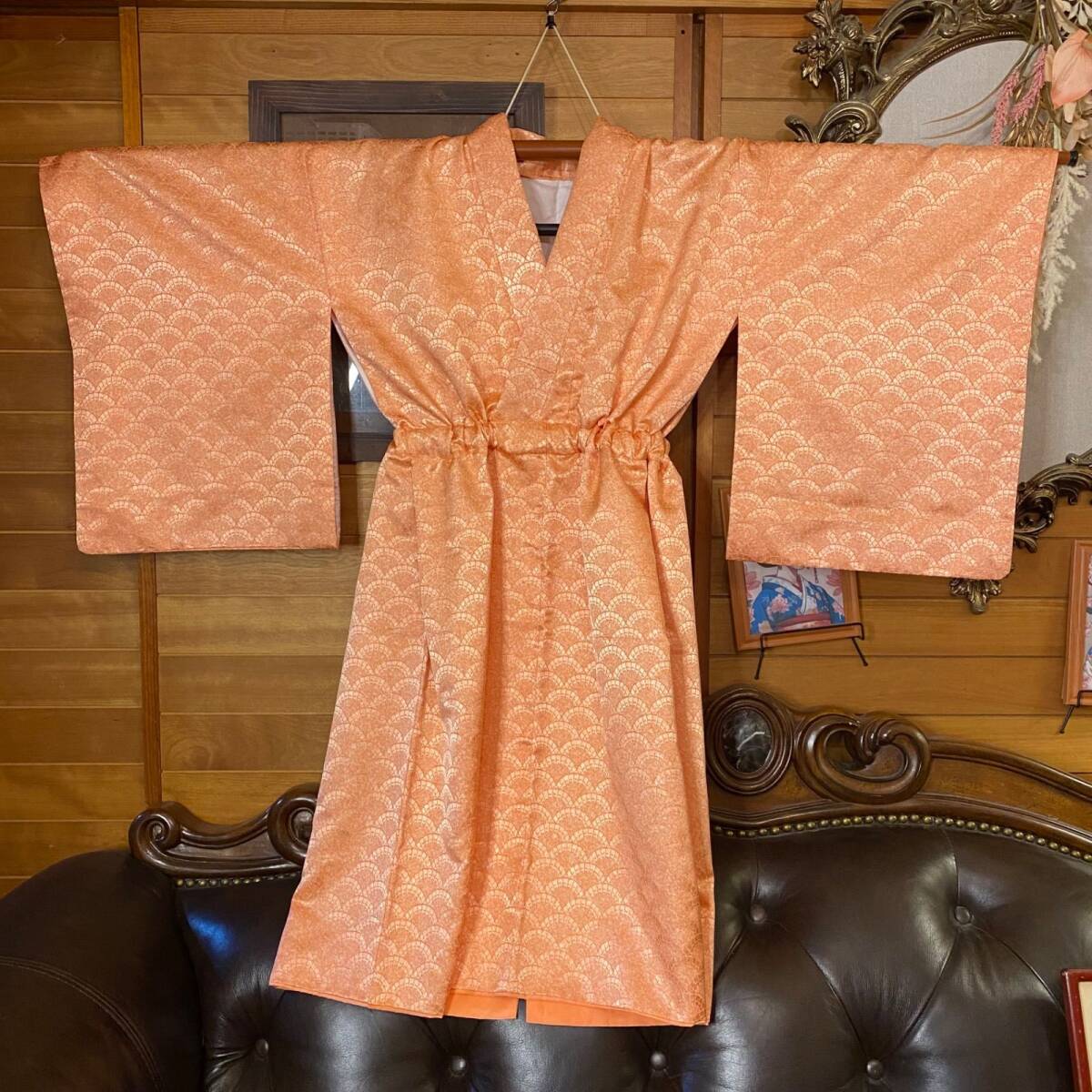 【着物リメイクワンピース ドレス ミニミディ 洗える化繊 + 帯サッシュベルト 和洋折衷 レトロ 古着 ハンドメイド やわらかな杏色(アプリコットオレンジ)KW1097】