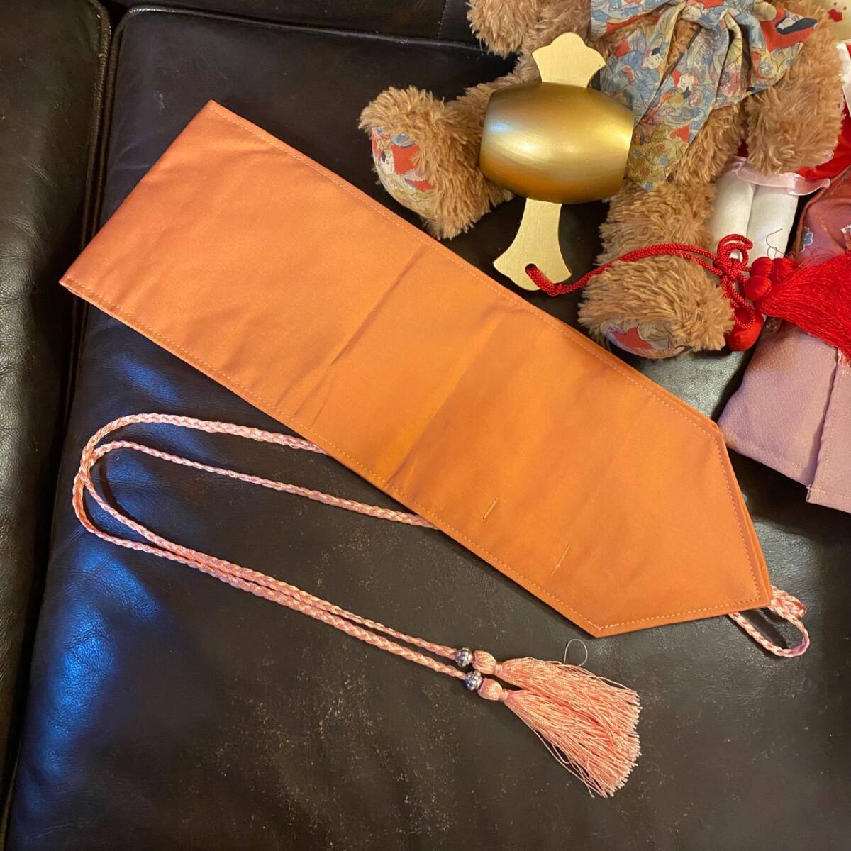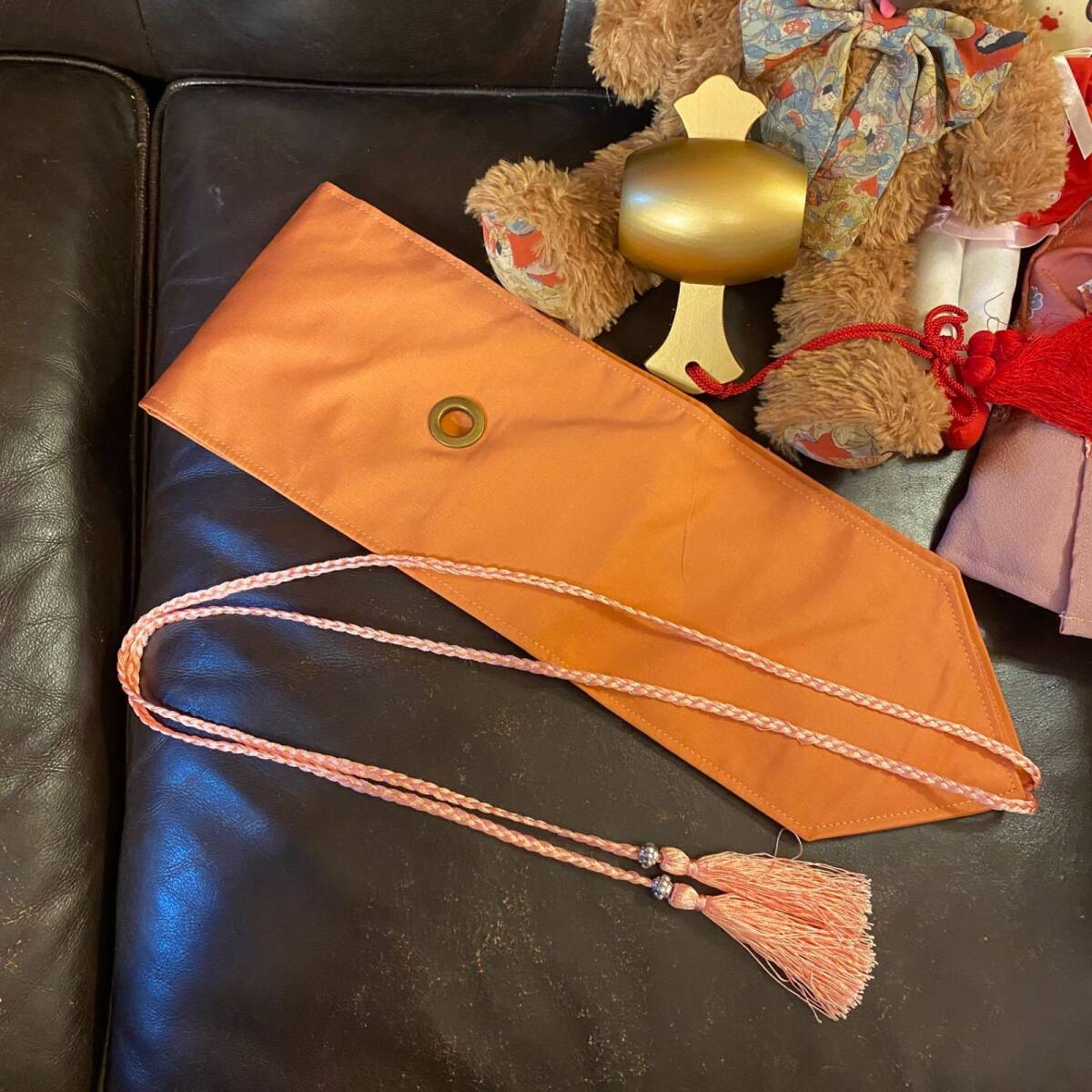 同系色の帯風ベルトをきゅっと結んで、淡桃の組紐タッセルが軽やかに揺れるアクセント。