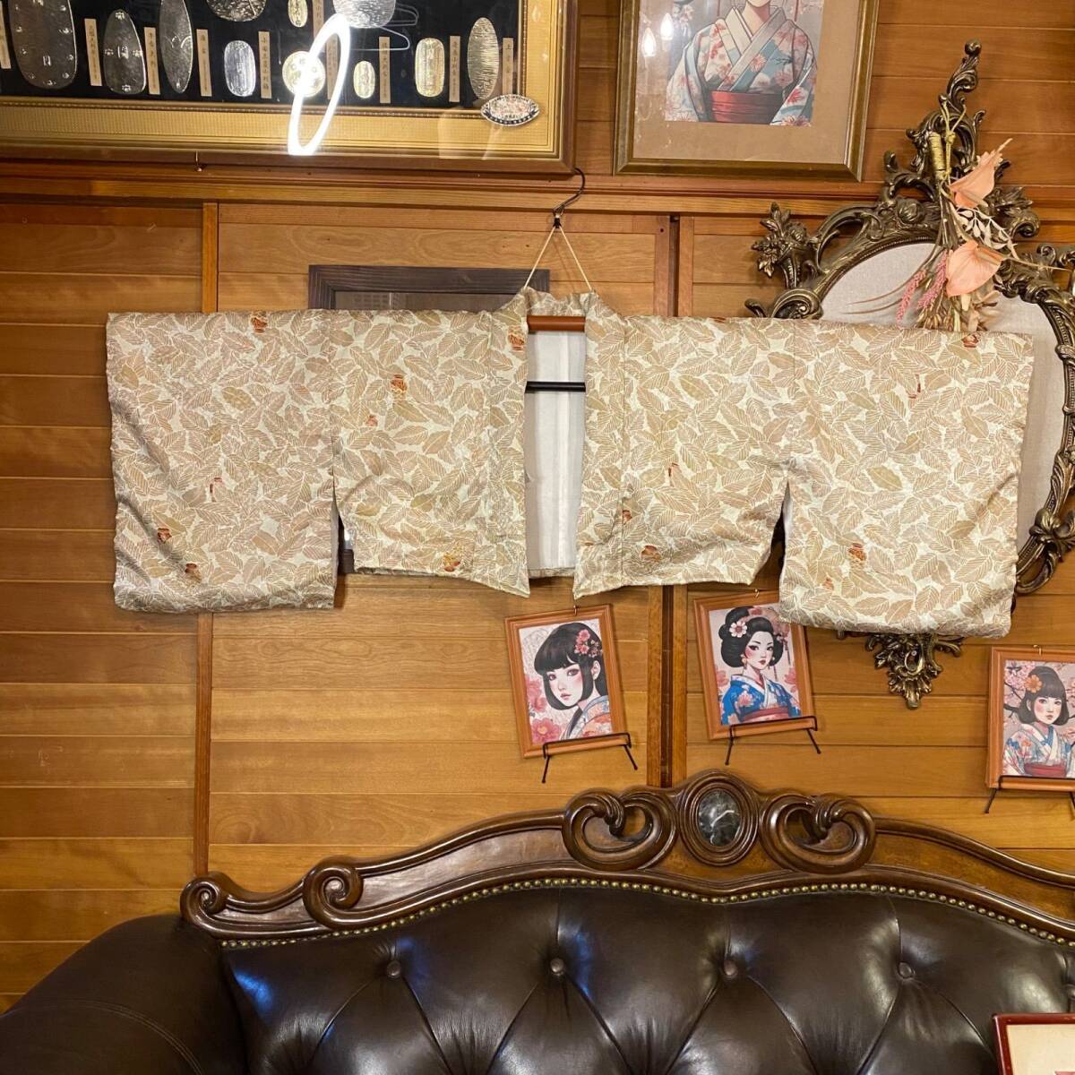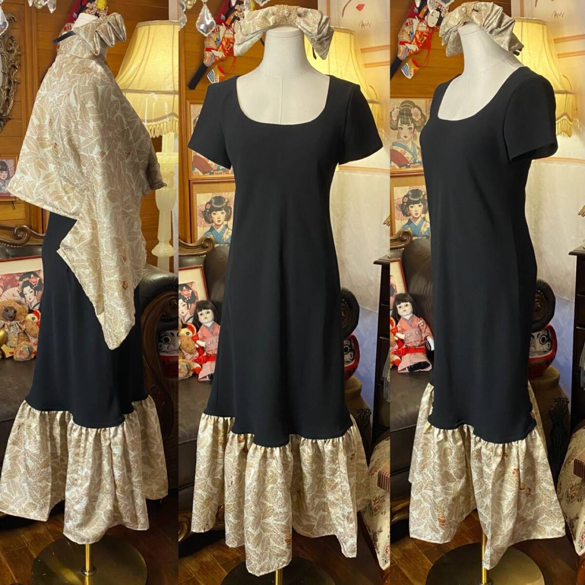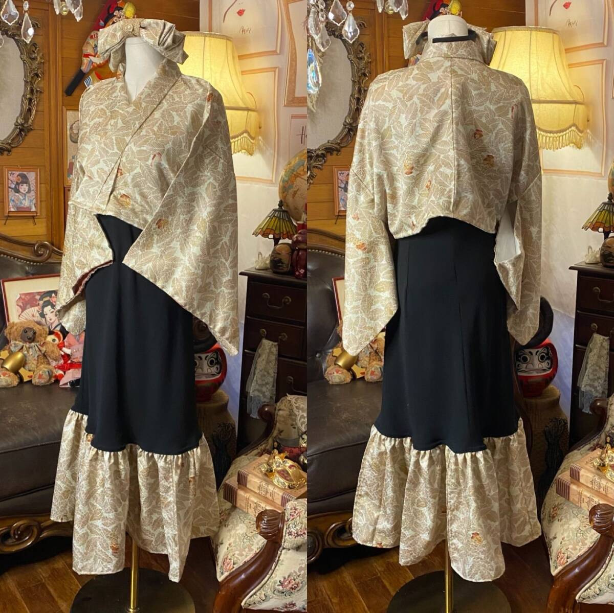 【 着物 ハンドメイド ワンピース パーティー ドレス 和洋折衷 コラージュ リメイク 切り替え やわらかなシャンパンベージュの地に、光の粒を含む上品な艶。 O-67】
