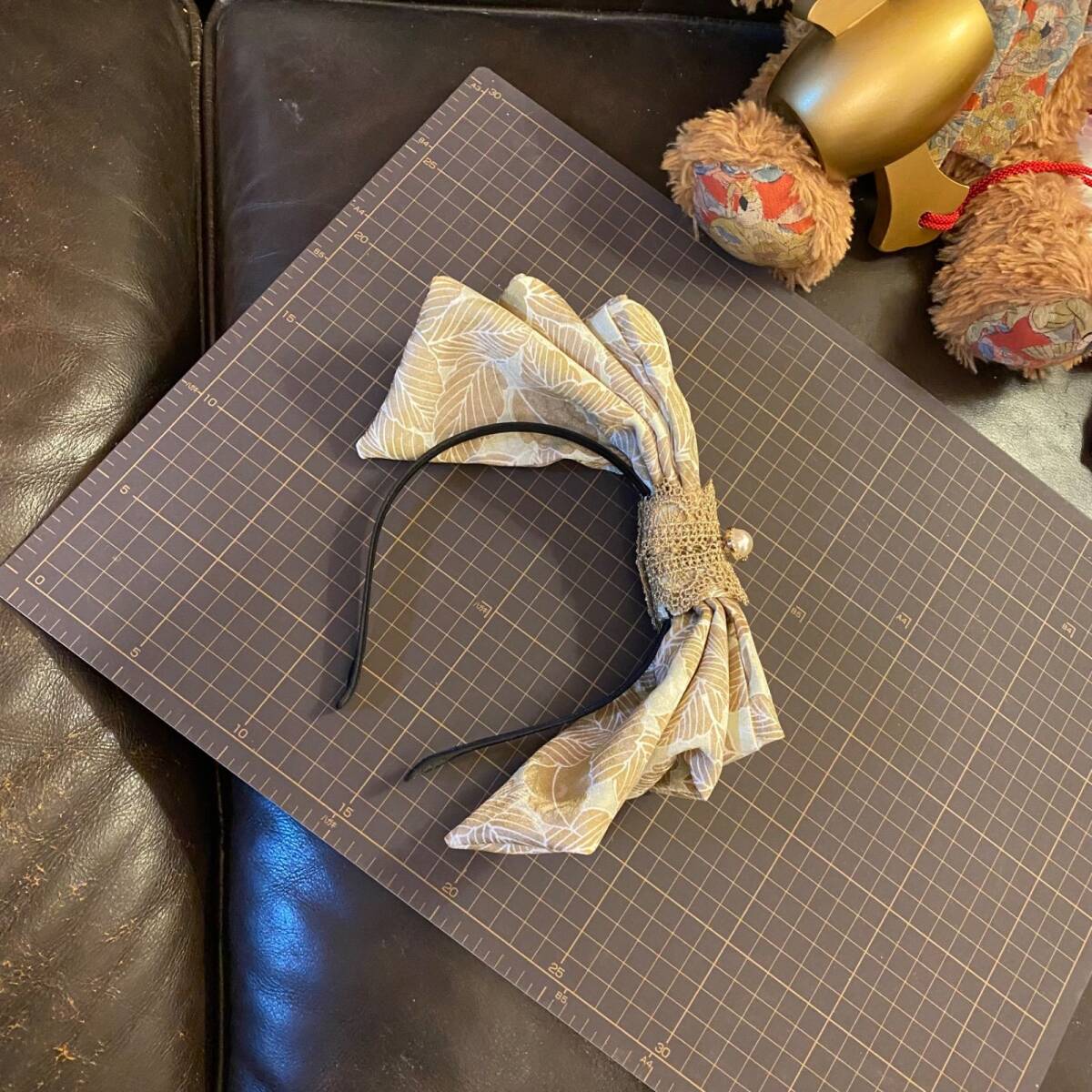 仕上げは同生地のビッグリボンカチューシャ(パール×レース中心)で、顔まわりまで明るく。
