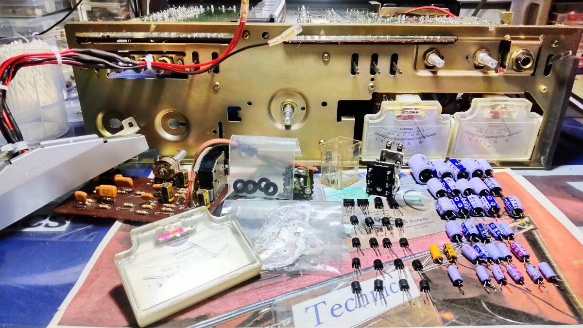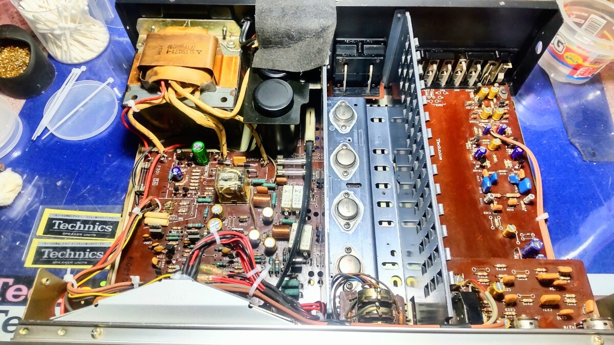 テクニクスのこのシリーズのアンプでは前作のSU-7700を含めとてもガッツなサウンドと高域も綺麗に再生されるのがこのシリーズのアンプの特色とも言えると思います!それはトーンコントロールの変化も絶大な事とラウドネス効果も抜群な事も良さと言えると思います、そして最終生産モデルのこの7700Ⅱでは更にそれに磨きが掛かってる様に感じます、それは終段のトランジスタには現在も評価の高いメタルキャントランジスタが採用されてるのも底上げがされてる1つの要因だとも感じます、この様なサウンドを聴かせてくれるアンプでは有りますが更に音質改善及び向上を主として電解コンデンサーも音質の良いコンデンサーを私なりに考えインストールして組み上げてますので更に楽しめるサウンドを聴かせてくれると思ってます!70年代のアンプではこの電解コンデンサーの交換のメンテナンスは非常に有効と考えます、その他のメンテナンスにおきましても半田のクラック等による不具合で半田の補修、補強が必須と考える箇所も多数有ります、ですのでその時に手を掛けた個体にはその箇所には異常が無い場合でも今後の使用を踏まえ一律に取り入れるメンテナンスも行ってます、又現在はレコードやカセットテープ等を含めアナログの音源が非常に見直されてる事実も有ります、それにはアナログならではの心地良さや少々手間が掛かるのもオーディオの1つの楽しさと感じられてる点も背景に有ると考えます!勿論CD等のデジタル音源につきましても良音で再生される事につきましても今更改めて言う事では無いと思います