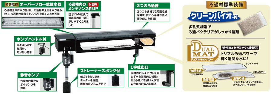 60cm水槽用上部フィルターとウェット&ドライろ過槽のセットです。(淡水・海水両用)2つのろ過槽で2段回ろ過を実現。広い濾過槽が高い浄化能力を発揮します。ウェット&ドライろ過槽をプラスして、ろ過効率をさらにアップ! 【特長・上部フィルター】●2つの濾過槽が、物理・吸着・生物のろ過サイクルを実現。汚れた水を素早くキレイにし、キレイな水が長続きします。●オーバーフロー式散水器により、ろ過槽全体に水が循環し、ろ過材能力を100%引き出します。●すばやい水作りができる、2つのろ材「デュアルマットパワー」と「クリーンバイオ-N」を標準で装備しました。●作動音の静かな水中ポンプを採用しました。●省エネモーターを採用。気になる電気代を抑えて、節電にしっかり対応。●ストレーナースポンジ付きで、モーターを異物などから保護し、また稚魚の吸い込みを防止します。 【特長・ウェット&ドライろ過槽】●ろ過槽内に水を溜めずに、常にろ過材が酸素と水に触れる状態を作ります。●上部のろ過槽底全体から、シャワーのように水を下段のろ過槽に落とします。●下段でダム式にろ過槽内へ水を溜め、ろ過材が水没した状態を作ります。※ウェット&ドライろ過槽用のろ過材は付属していません。別途お買い求めください。