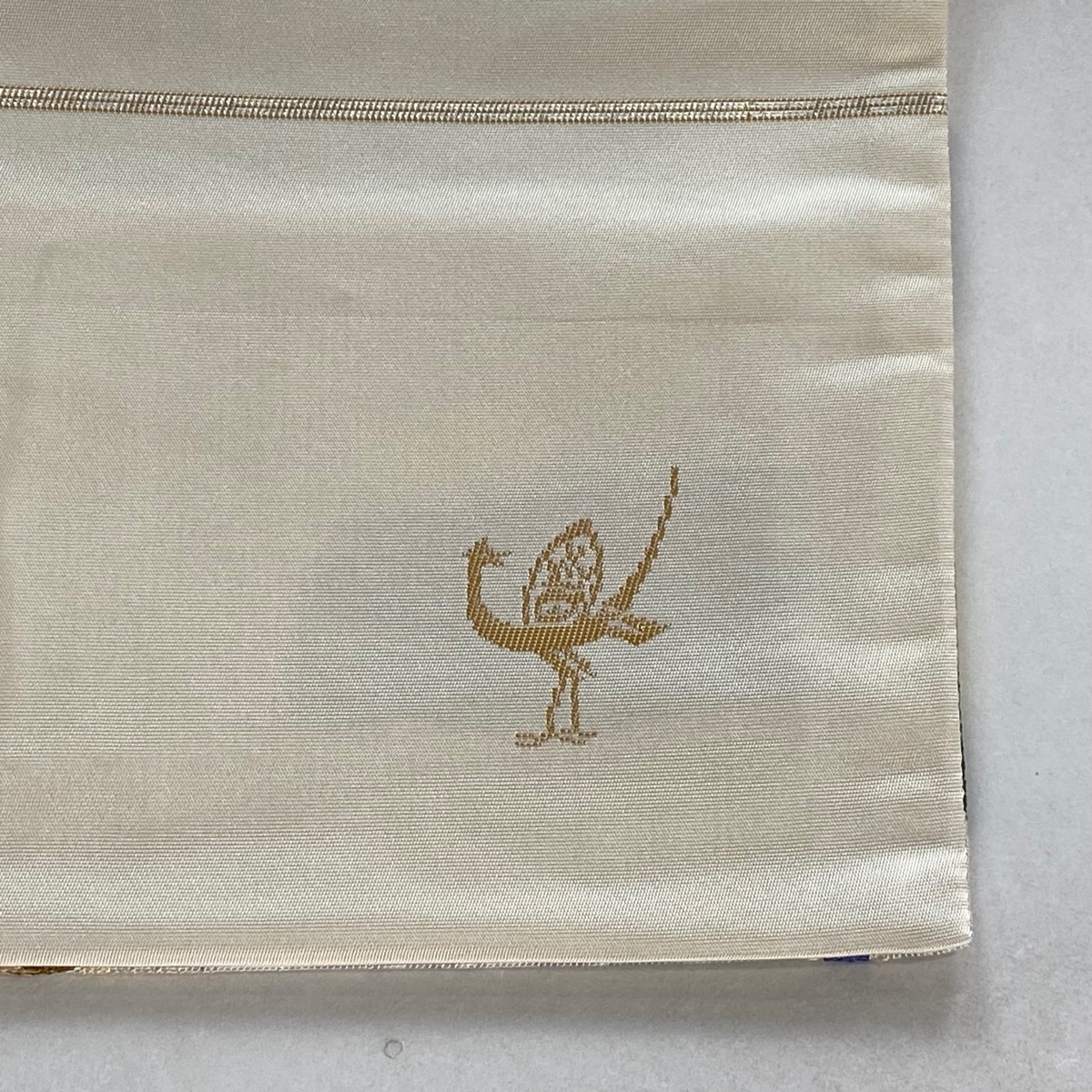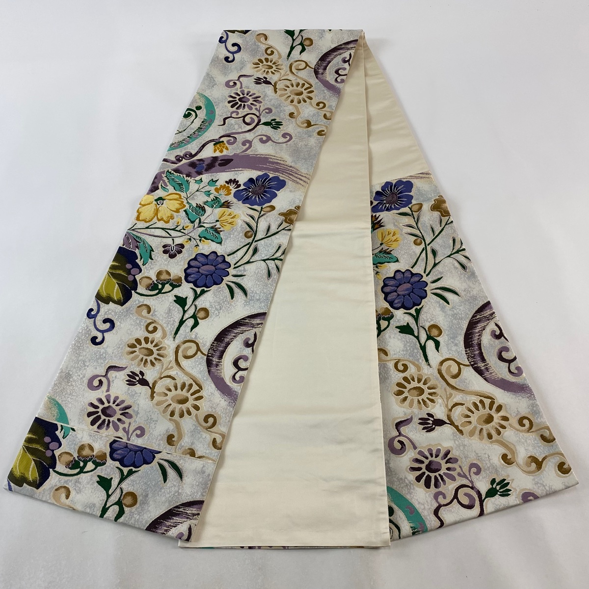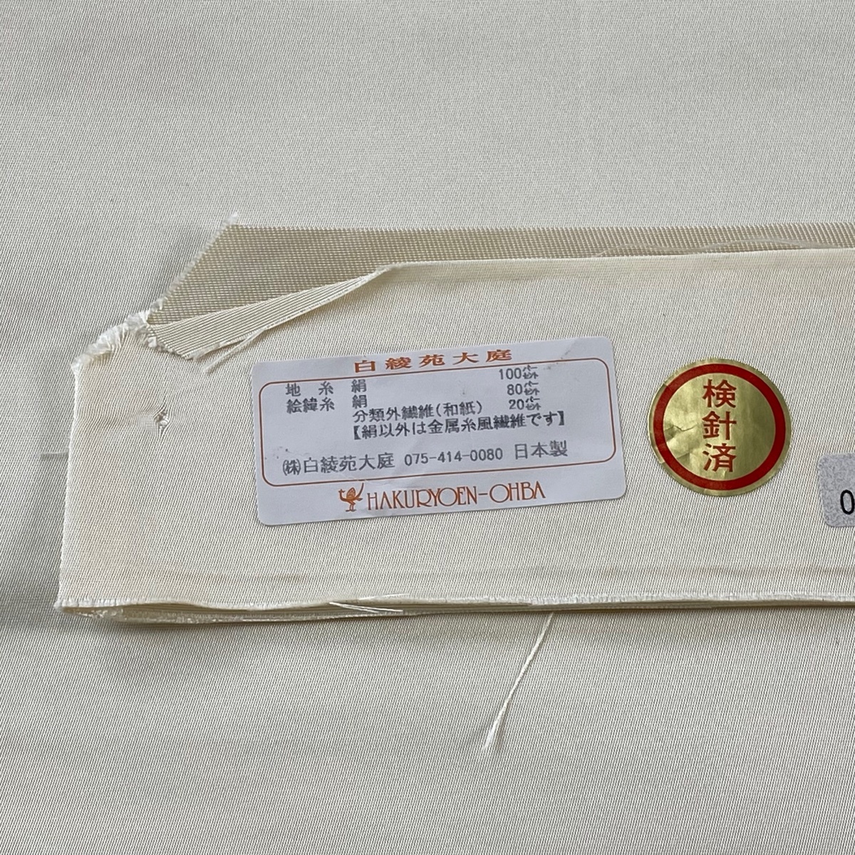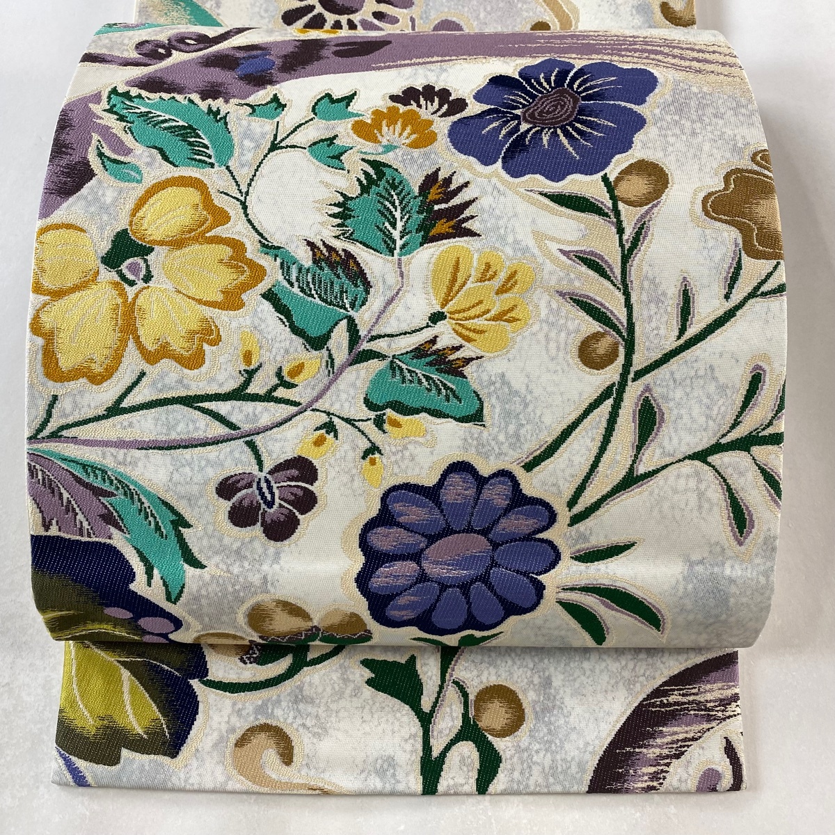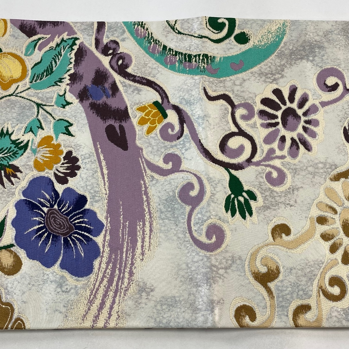 | 袋帯 美品 逸品 白綾苑大庭 落款 証紙 草花 刺繍 灰色 六通 正絹 【中古】 |