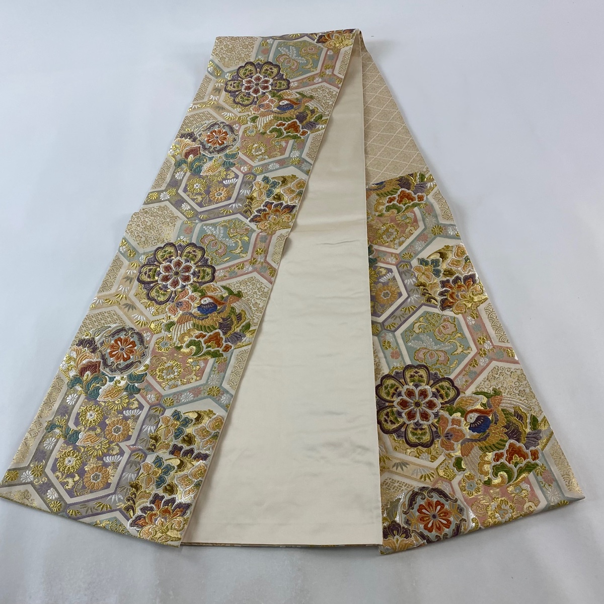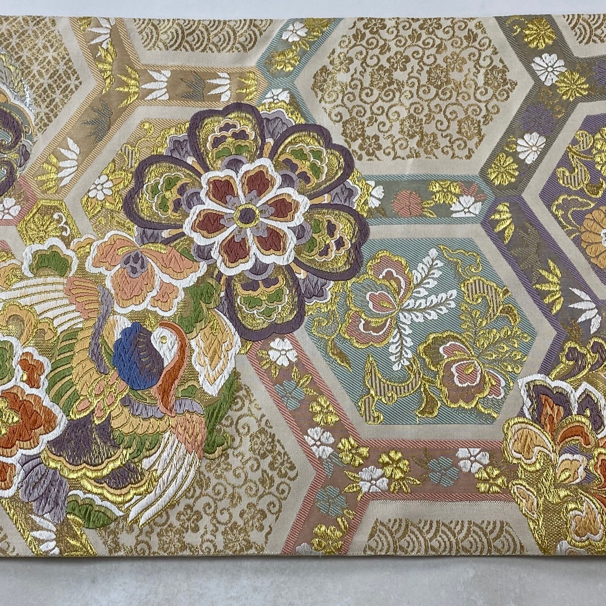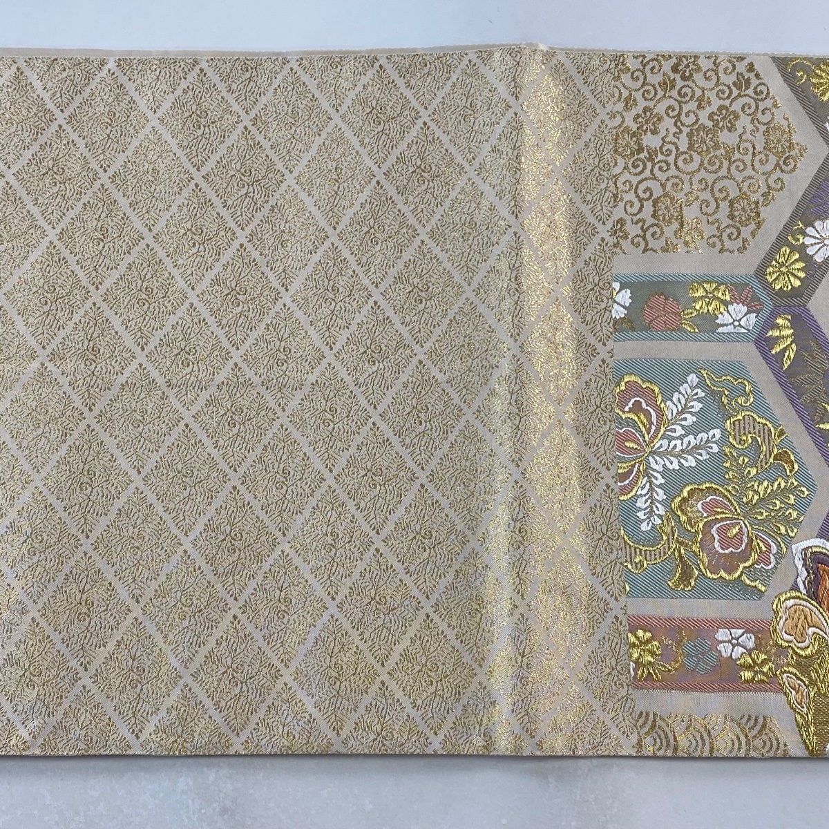 | 袋帯 美品 秀品 豊彩聚宝文 花鳥 唐織 箔 ベージュ 六通 正絹 【中古】 |