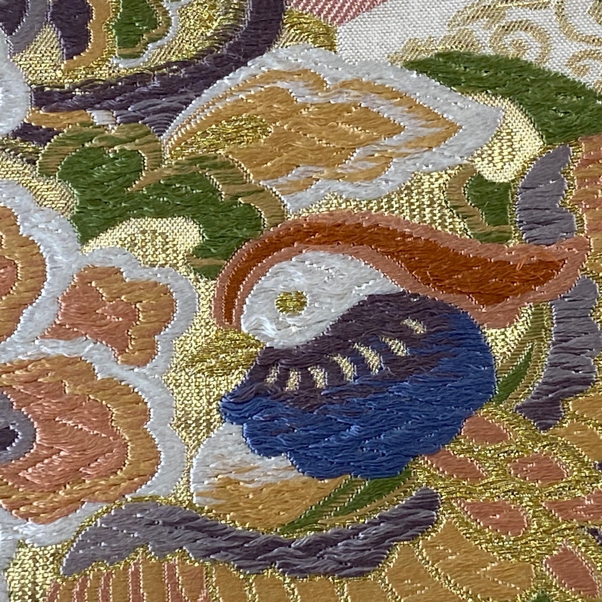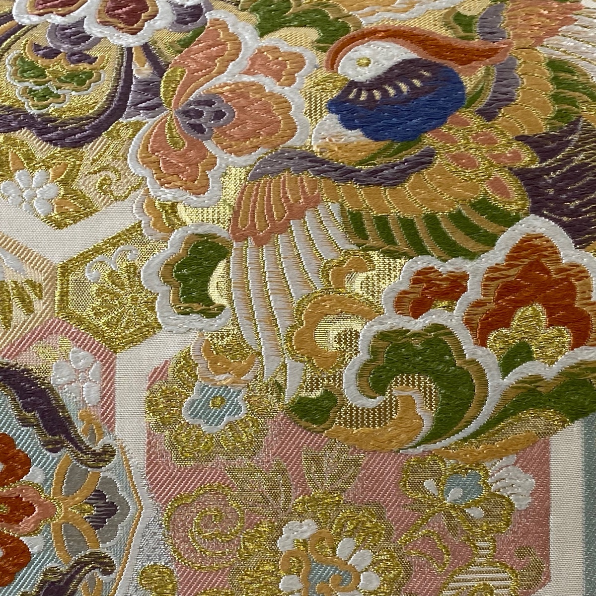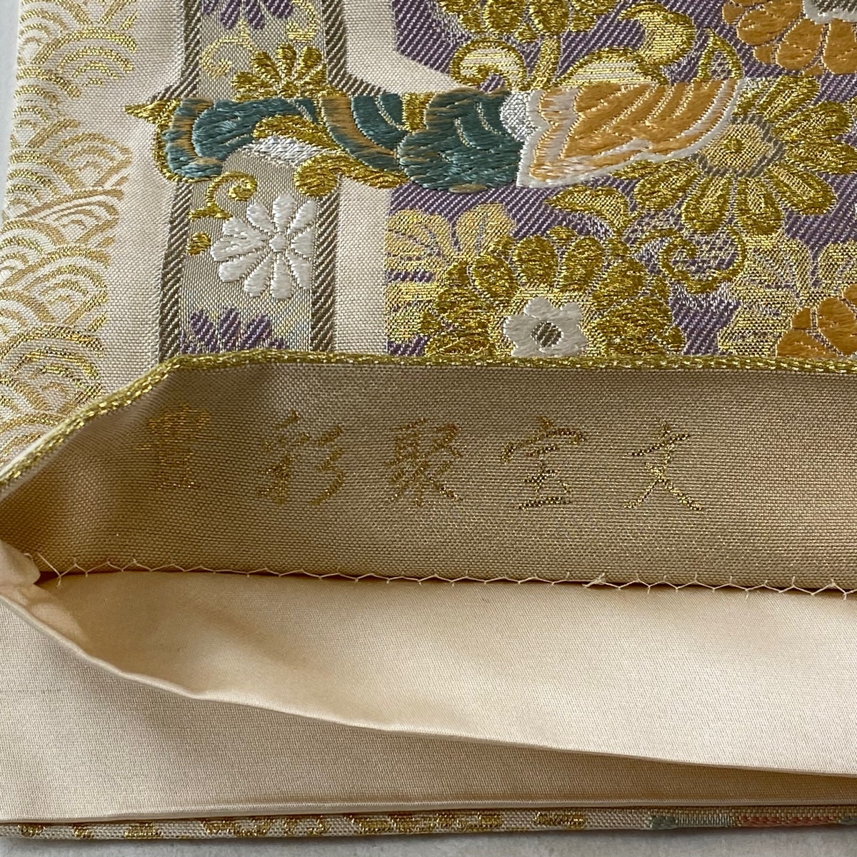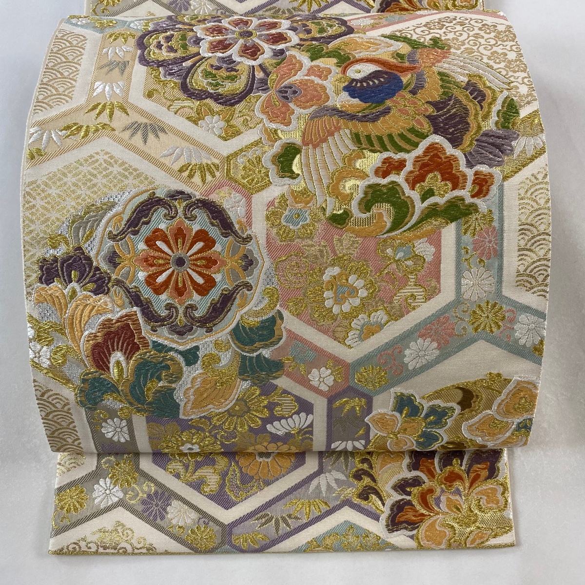 | 袋帯 美品 秀品 豊彩聚宝文 花鳥 唐織 箔 ベージュ 六通 正絹 【中古】 |